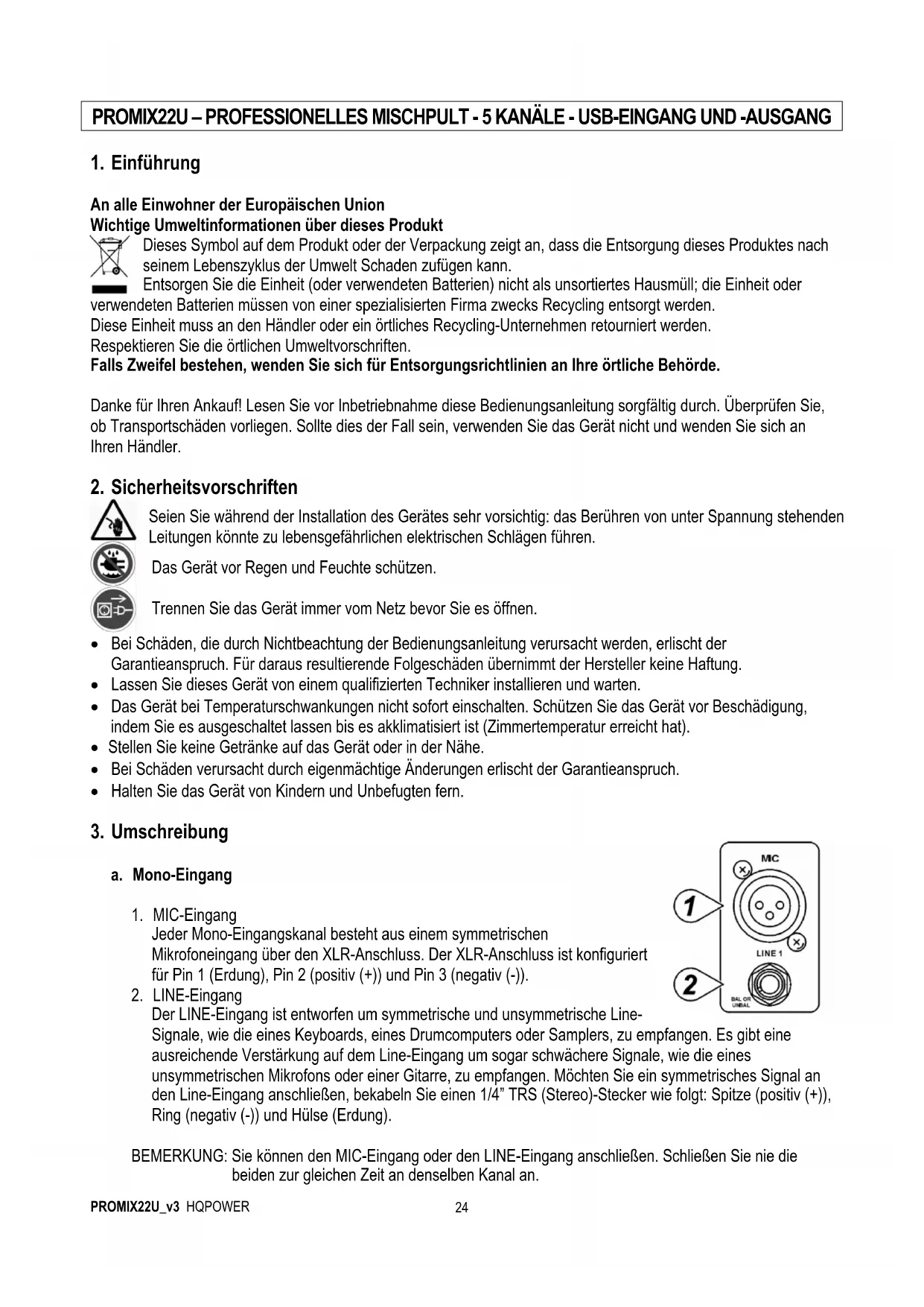 Der LINE-Eingang ist entworfen um symmetrische und unsymmetrische Line- Signale, wie die eines Keyboards, eines Drumcomputers oder Samplers, zu empfangen. Es gibt eine ausreichende Verstärkung auf dem Line-Eingang um sogar schwächere Signale, wie die eines unsymmetrischen Mikrofons oder einer Gitarre, zu empfangen. Möchten Sie ein symmetrisches Signal an den Line-Eingang anschließen, bekabeln Sie einen 1/4” TRS (Stereo)-Stecker wie folgt: Spitze (positiv (+)), Ring (negativ (-)) und Hülse (Erdung). BEMERKUNG: Sie können den MIC-Eingang oder den LINE-Eingang anschließen. Schließen Sie nie die beiden zur gleichen Zeit an denselben Kanal an. Seien Sie während der Installation des Gerätes sehr vorsichtig: das Berühren von unter Spannung stehenden Leitungen könnte zu lebensgefährlichen elektrischen Schlägen führen. Das Gerät vor Regen und Feuchte schützen. Trennen Sie das Gerät immer vom Netz bevor Sie es öffnen.PROMIX22U_v3 HQPOWER