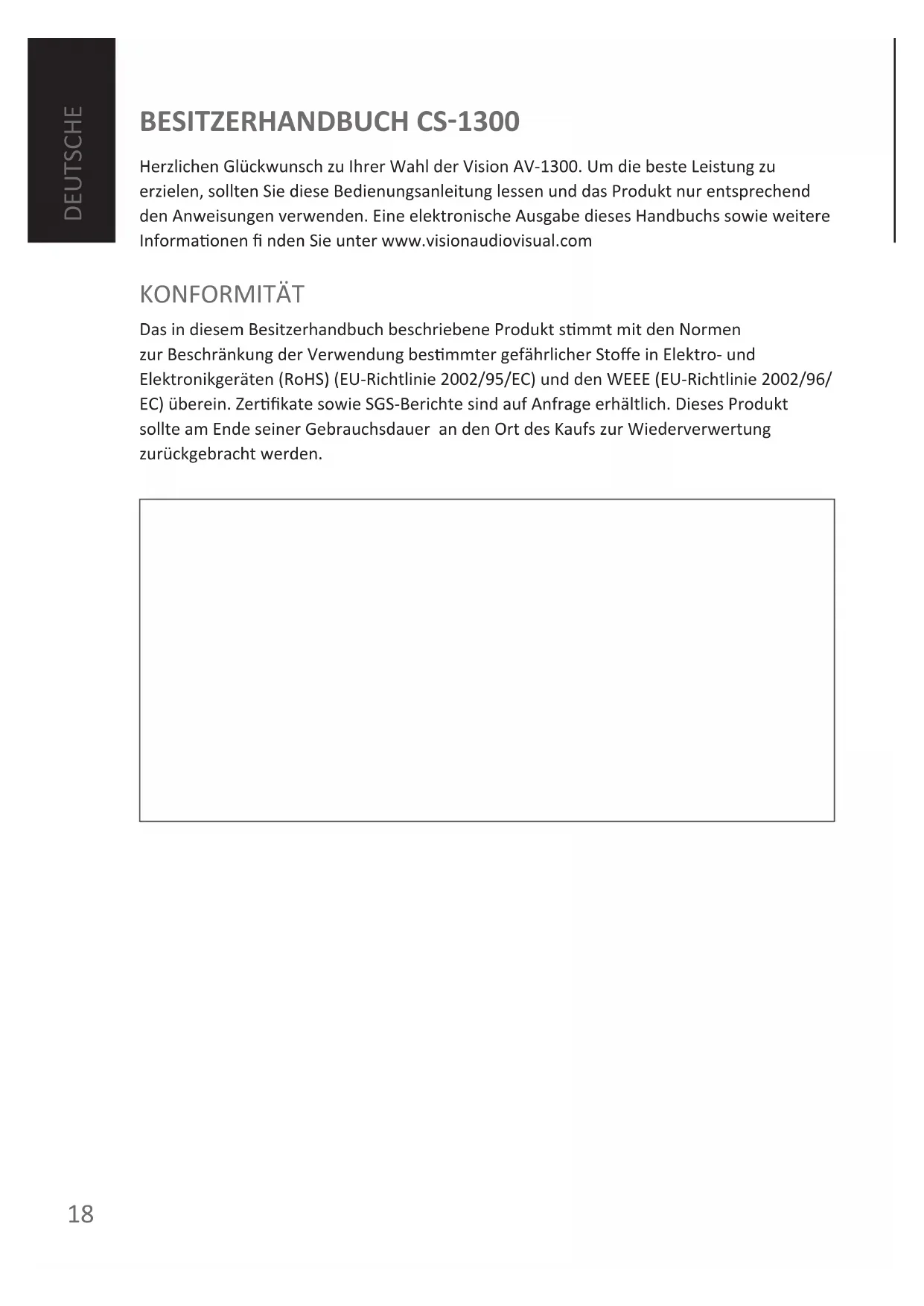 Herzlichen Glückwunsch zu Ihrer Wahl der Vision AV-1300. Um die beste Leistung zu