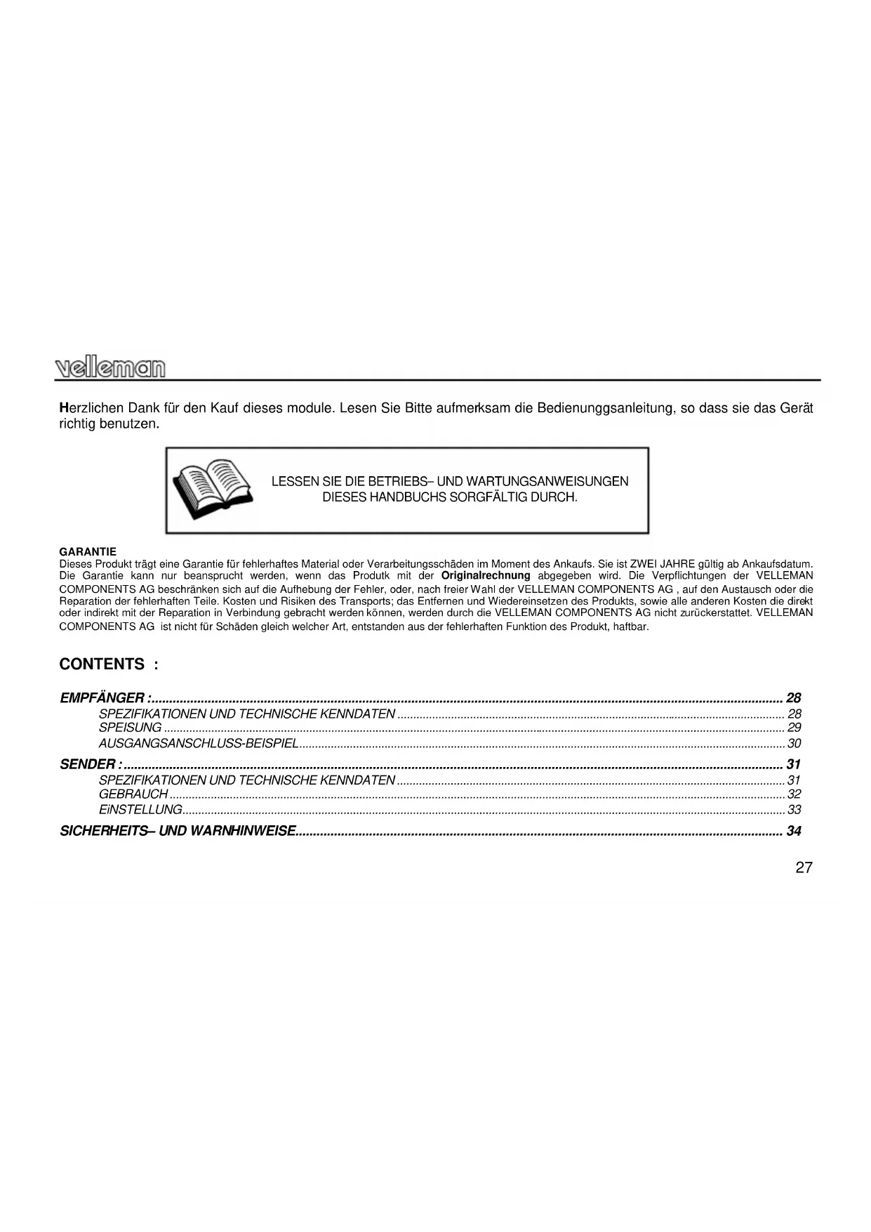 GARANTIE Dieses Produkt trägt eine Garantie für fehlerhaftes Material oder Verarbeitungsschäden im Moment des Ankaufs. Sie ist ZWEI JAHRE gültig ab Ankaufsdatum. Die Garantie kann nur beansprucht werden, wenn das Produtk mit der Originalrechnung abgegeben wird. Die Verpflichtungen der VELLEMAN COMPONENTS AG beschränken sich auf die Aufhebung der Fehler, oder, nach freier Wahl der VELLEMAN COMPONENTS AG , auf den Austausch oder die Reparation der fehlerhaften Teile. Kosten und Risiken des Transports; das Entfernen und Wiedereinsetzen des Produkts, sowie alle anderen Kosten die direkt oder indirekt mit der Reparation in Verbindung gebracht werden können, werden durch die VELLEMAN COMPONENTS AG nicht zurückerstattet. VELLEMAN COMPONENTS AG ist nicht für Schäden gleich welcher Art, entstanden aus der fehlerhaften Funktion des Produkt, haftbar.
