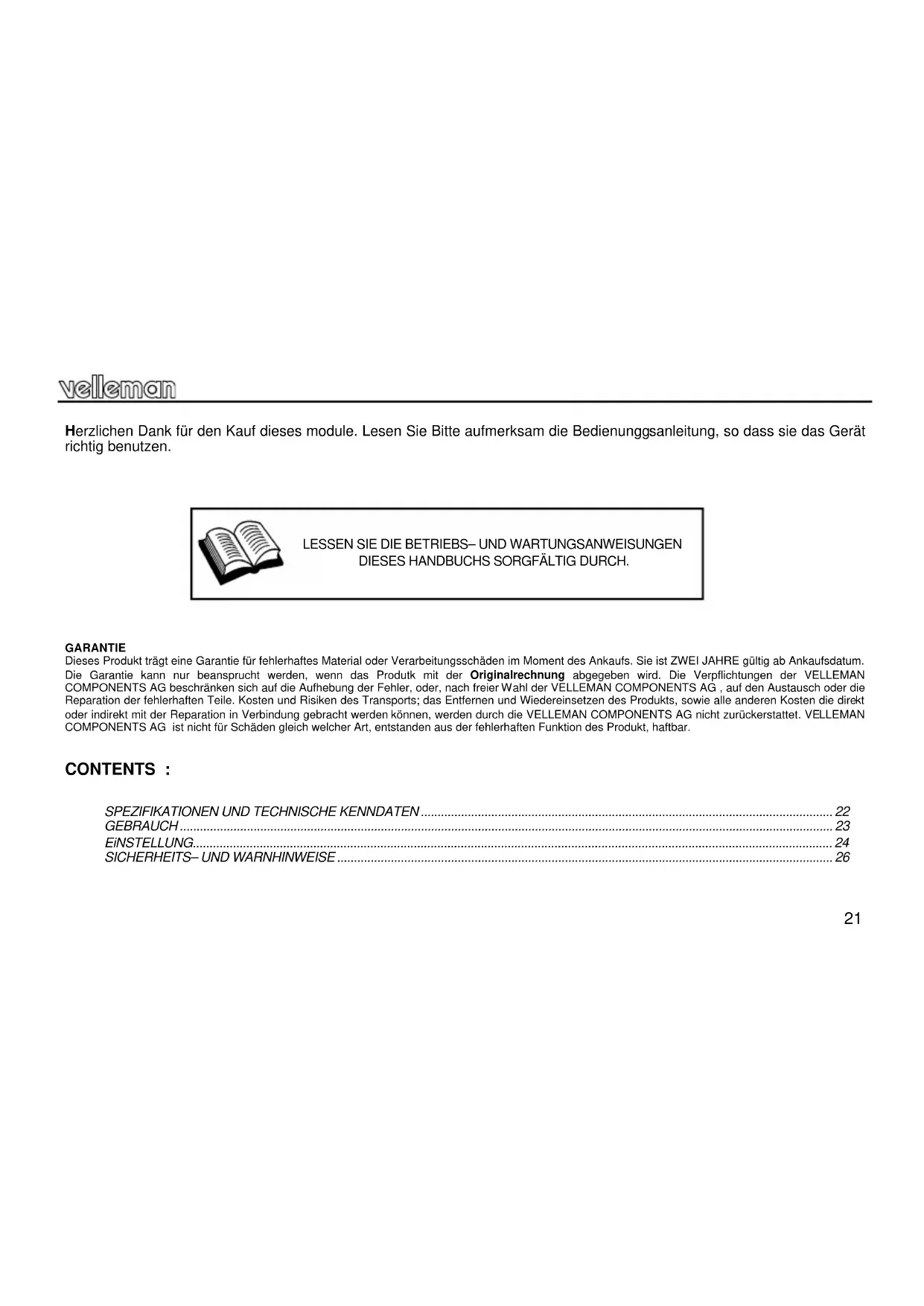GARANTIE Dieses Produkt trägt eine Garantie für fehlerhaftes Material oder Verarbeitungsschäden im Moment des Ankaufs. Sie ist ZWEI JAHRE gültig ab Ankaufsdatum. Die Garantie kann nur beansprucht werden, wenn das Produtk mit der Originalrechnung abgegeben wird. Die Verpflichtungen der VELLEMAN COMPONENTS AG beschränken sich auf die Aufhebung der Fehler, oder, nach freier Wahl der VELLEMAN COMPONENTS AG , auf den Austausch oder die Reparation der fehlerhaften Teile. Kosten und Risiken des Transports; das Entfernen und Wiedereinsetzen des Produkts, sowie alle anderen Kosten die direkt oder indirekt mit der Reparation in Verbindung gebracht werden können, werden durch die VELLEMAN COMPONENTS AG nicht zurückerstattet. VELLEMAN COMPONENTS AG ist nicht für Schäden gleich welcher Art, entstanden aus der fehlerhaften Funktion des Produkt, haftbar.
