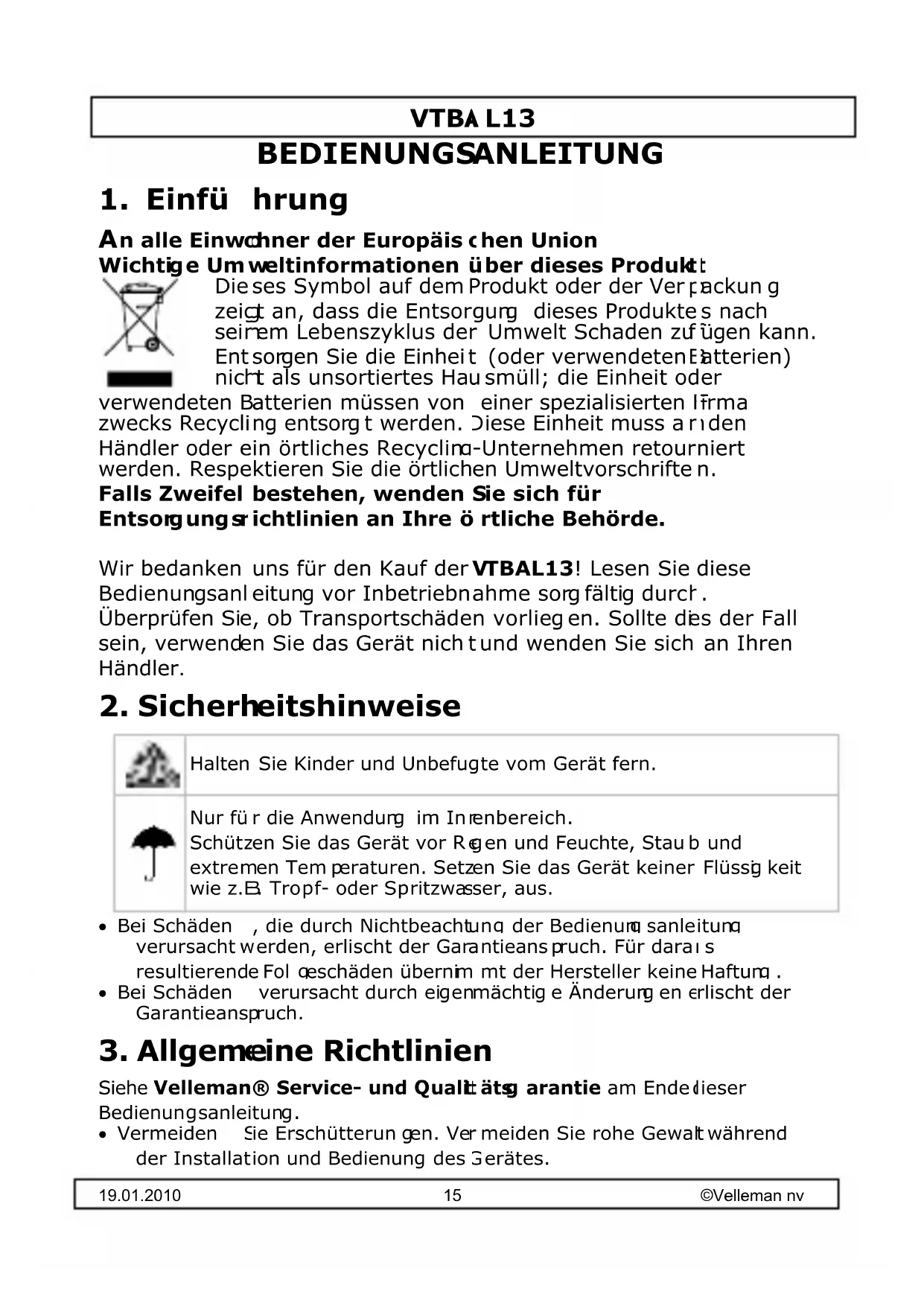 Wir bedanken uns für den Kauf der VTBAL13! Lesen Sie diese Bedienungsanleitung vor Inbetriebnahme sorg fältig durch.