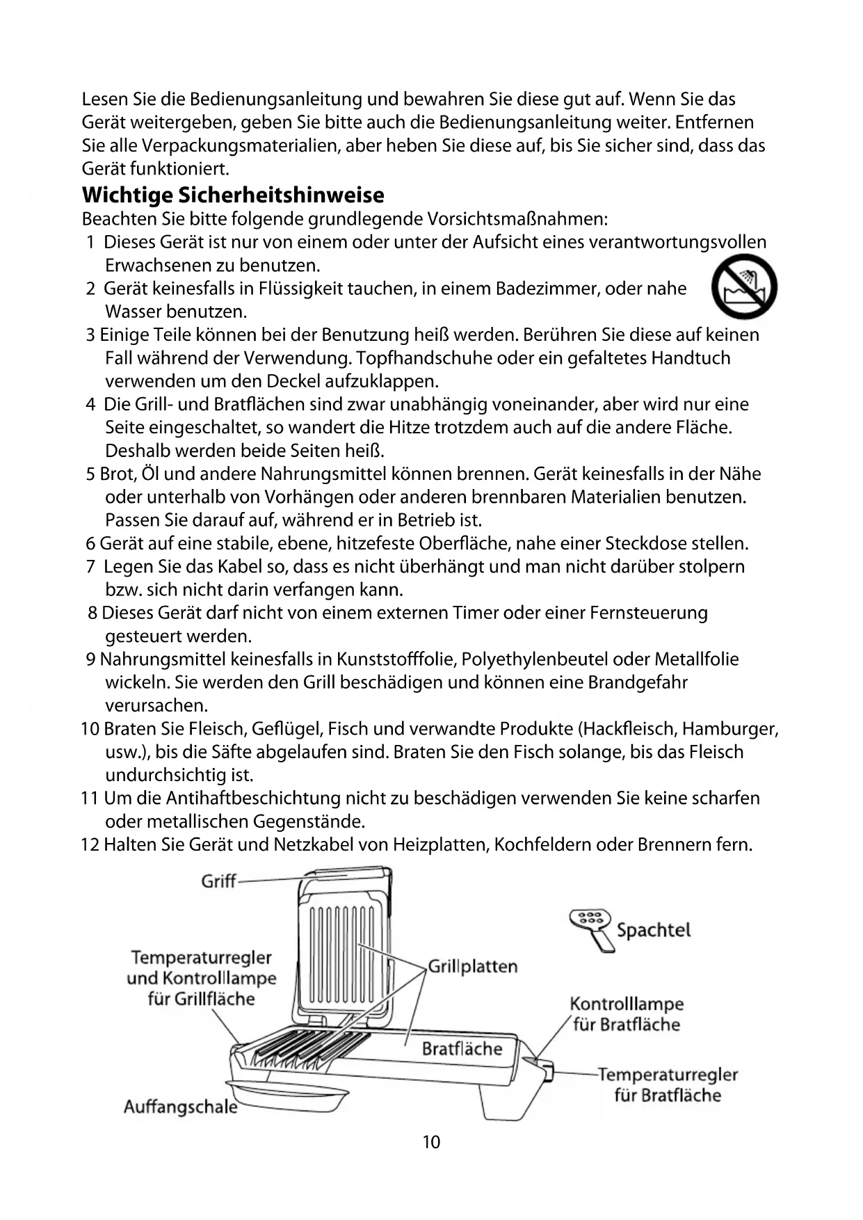 - Se sirve con tortillas de harina y los complementos favoritos.910 Lesen Sie die Bedienungsanleitung und bewahren Sie diese gut auf. Wenn Sie das Gerät weitergeben, geben Sie bitte auch die Bedienungsanleitung weiter. Entfernen Sie alle Verpackungsmaterialien, aber heben Sie diese auf, bis Sie sicher sind, dass das Gerät funktioniert. Wichtige Sicherheitshinweise Beachten Sie bitte folgende grundlegende Vorsichtsmaßnahmen: 1 Dieses Gerät ist nur von einem oder unter der Aufsicht eines verantwortungsvollen Erwachsenen zu benutzen. 2 Gerät keinesfalls in Flüssigkeit tauchen, in einem Badezimmer, oder nahe Wasser benutzen. 3 Einige Teile können bei der Benutzung heiß werden. Berühren Sie diese auf keinen Fall während der Verwendung. Topfhandschuhe oder ein gefaltetes Handtuch verwenden um den Deckel aufzuklappen. 4 Die Grill- und Bratflächen sind zwar unabhängig voneinander, aber wird nur eine Seite eingeschaltet, so wandert die Hitze trotzdem auch auf die andere Fläche. Deshalb werden beide Seiten heiß. 5 Brot, Öl und andere Nahrungsmittel können brennen. Gerät keinesfalls in der Nähe oder unterhalb von Vorhängen oder anderen brennbaren Materialien benutzen. Passen Sie darauf auf, während er in Betrieb ist. 6 Gerät auf eine stabile, ebene, hitzefeste Oberfläche, nahe einer Steckdose stellen. 7 Legen Sie das Kabel so, dass es nicht überhängt und man nicht darüber stolpern bzw. sich nicht darin verfangen kann. 8 Dieses Gerät darf nicht von einem externen Timer oder einer Fernsteuerung gesteuert werden. 9 Nahrungsmittel keinesfalls in Kunststofffolie, Polyethylenbeutel oder Metallfolie wickeln. Sie werden den Grill beschädigen und können eine Brandgefahr verursachen. 10 Braten Sie Fleisch, Geflügel, Fisch und verwandte Produkte (Hackfleisch, Hamburger, usw.), bis die Säfte abgelaufen sind. Braten Sie den Fisch solange, bis das Fleisch undurchsichtig ist. 11 Um die Antihaftbeschichtung nicht zu beschädigen verwenden Sie keine scharfen oder metallischen Gegenstände. 12 Halten Sie Gerät und Netzkabel von Heizplatten, Kochfeldern oder Brennern fern.11 13 Netzstecker des Geräts vor Umstellen und vor Säubern herausziehen und Gerät abkühlen lassen. 14 Gerät keinesfalls für irgendwelche anderen Zwecke als zur Zubereitung von Nahrung verwenden. 15 Benutzen Sie das Gerät keinesfalls, wenn es beschädigt ist oder Fehlfunktionen zeigt. 16 Weist das Kabel Beschädigungen auf, muss es vom Hersteller, einer Wartungsvertretung des Herstellers oder einer qualifizierten Fachkraft ersetzt werden, um eine mögliche Gefährdung auszuschließen. Nur für den Gebrauch im Haushalt geeignet Vor erstmaligem Gebrauch Kochplatten mit einem feuchten Tuch abwischen. Aufstellen 1 Gerät auf eine stabile, ebene, hitzefeste Oberfläche, nahe einer Steckdose stellen. 2 Lassen Sie um das Gerät herum einen Abstand von mindestens 50mm. 3 Legen Sie das Kabel so, dass es nicht überhängt und man nicht darüber stolpern bzw. sich nicht darin verfangen kann. Grillen oder Braten? 4 Die Grill- und Bratflächen sind voneinander unabhängig. Sie können jede einzeln, oder beide gleichzeitig benutzen. Jede hat einen eigenen Temperaturregler mit Kontrolllampe. 5 Jeder Temperaturregler ist von 0(aus) bis 3(max) gekennzeichnet. 6 Jede Kontrolllampe leuchtet während des Aufheizens auf, sie erlischt, sobald die eingestellte Temperatur erreicht ist, anschließend schaltet sich das Thermostat ein und aus, da es versucht die Temperatur zu halten. Zubereitung 7 Etwaige Garnierung (Gurken, Tomaten, usw.) zubereiten, und die verschiedenen Brötchen aufschneiden. 8 Schneiden Sie das Gargut nicht über 25mm dick. 9 Zentrieren Sie die Auffangschale unter die Vorderseite des Grills, so dass sie jeglichen Ablauf auffängt. 10 Wischen Sie die Kochplatten mit etwas Speiseöl oder Butter ab, danach schließen. Keinen fettarmen Brotaufstrich verwenden - er könnte am Grill anbrennen. 11 Gerätenetzstecker in die Steckdose stecken. Benutzen der Bratfläche 12 Verwenden Sie die Bratfläche für z.B. Eier, Pilze, Tomaten oder andere Speisen die im Grill zerdrückt oder verformt werden könnten. 13 Stellen Sie den Regler auf die gewünschte Stufe, warten Sie bis die Lampe erlischt, anschließend können Sie mit dem Braten beginnen. 14 Legen Sie die Nahrung mit einer Spachtel oder Zange, nicht mit den Fingern, auf die Kochplatte. 15 Die Bratfläche brät nur auf einer Seite. Das bedeutet, sie brät langsamer als der Grill und Sie müssen daran denken die Nahrung zu wenden, falls Sie beide Seiten braten wolllen. Bedienungsanleitung12 Benutzen der Grillfläche 16 Stellen Sie den Regler auf die gewünschte Stufe und warten Sie bis die Lampe erlischt, anschließend können Sie mit dem Grillen beginnen. 17 Legen Sie die Nahrung mit einer Spachtel oder Zange, nicht mit den Fingern, auf die untere Kochplatte. 18 Schließen Sie den Grill. Das Scharnier ist gelenkig, um sich an dicke oder dünne Nahrung anpassen zu können. 19 Die Kochplatten sollten in etwa parallel sein, um ungleichmäßiges Garen zu vermeiden. Nehmen Sie das Gargut heraus 20 Prüfen Sie ob diese gar ist. Im Zweifelsfall wieder rein geben und noch ein bisschen mehr garen lassen. 21 Verwenden Sie zum Herausnehmen der Speisen Grillbesteck aus Holz oder Plastik. Fertig? 22 Ziehen Sie den Netzstecker des Grills heraus. Mehr? 23 Topfhandschuh anziehen, Auffangschale in eine hitzefeste Schüssel entleeren, dann mit Küchenkrepp abwischen und unter die Vorderseite des Grills stellen. Pflege und Instandhaltung 24 Netzstecker herausziehen und den Grill abkühlen lassen bevor Sie den Grill säubern und wegräumen. 25 Alle Oberflächen mit einem sauberen, feuchten Tuch abwischen. Verwenden Sie ein mit etwas Speiseöl angefeuchtetes Papierhandtuch, um hartnäckige Flecken zu entfernen. 26 Auffangschale in warmem, seifigem Wasser oder im oberen Fach der Spülmaschine spülen. 27 Die antihaftbeschichteten Kochflächen sind besonders sorgfältig zu behandeln. 28 Den Grill k