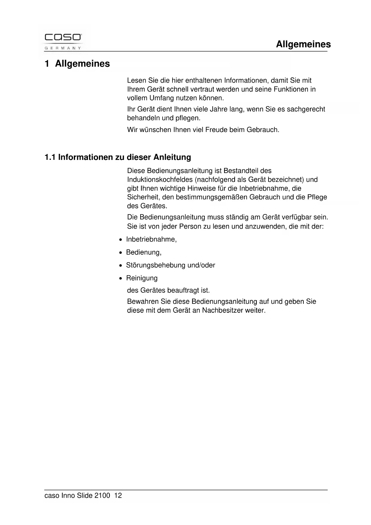 Diese Bedienungsanleitung ist Bestandteil des Induktionskochfeldes (nachfolgend als Gerät bezeichnet) und gibt Ihnen wichtige Hinweise für die Inbetriebnahme, die Sicherheit, den bestimmungsgemäßen Gebrauch und die Pflege des Gerätes. Die Bedienungsanleitung muss ständig am Gerät verfügbar sein. Sie ist von jeder Person zu lesen und anzuwenden, die mit der: Inbetriebnahme, Bedienung, Störungsbehebung und/oder Reinigung des Gerätes beauftragt ist. Bewahren Sie diese Bedienungsanleitung auf und geben Sie diese mit dem Gerät an Nachbesitzer weiter.Allgemeines caso Inno Slide 2100 13
