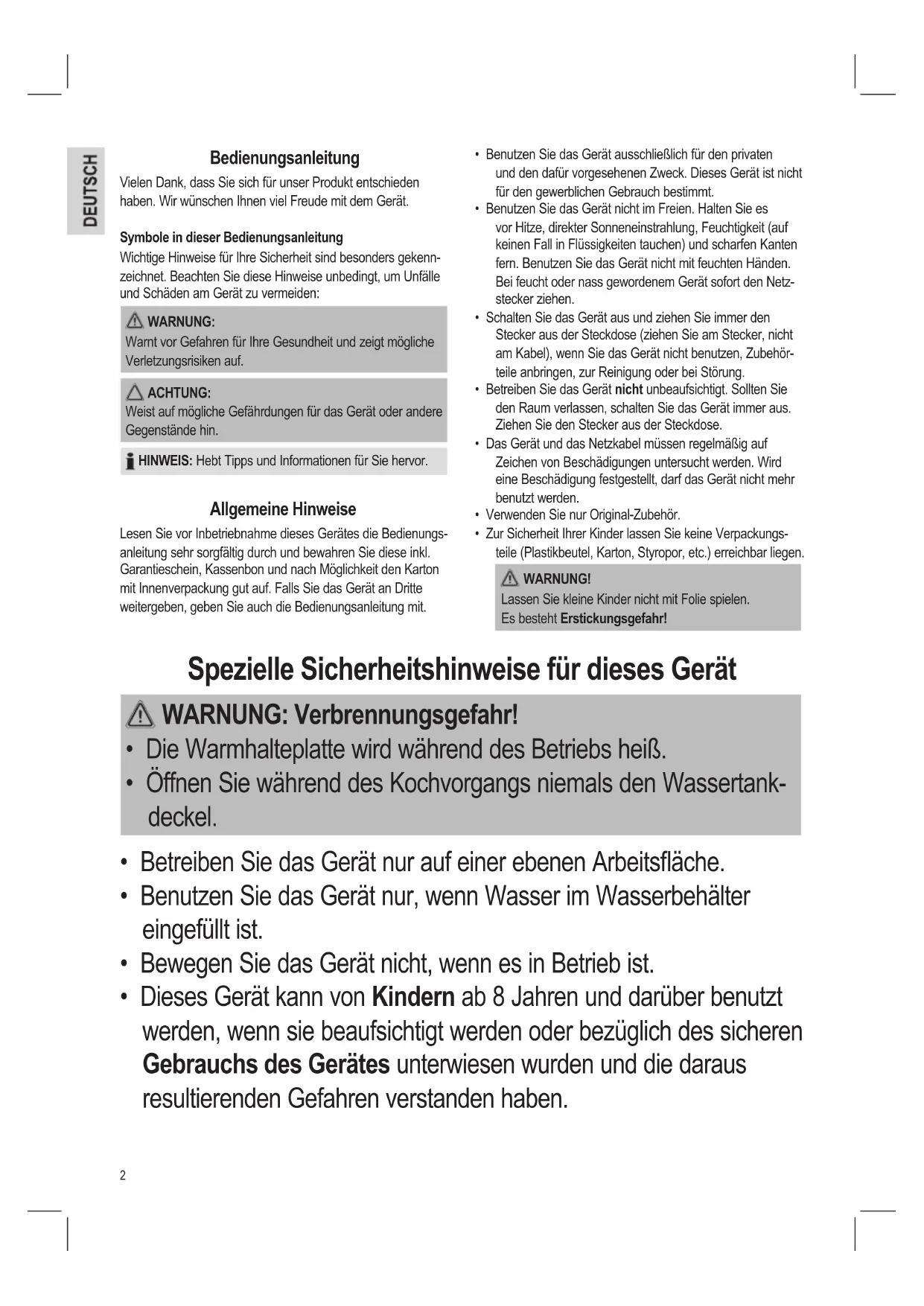 • Öffnen Sie während des Kochvorgangs niemals den Wassertank-