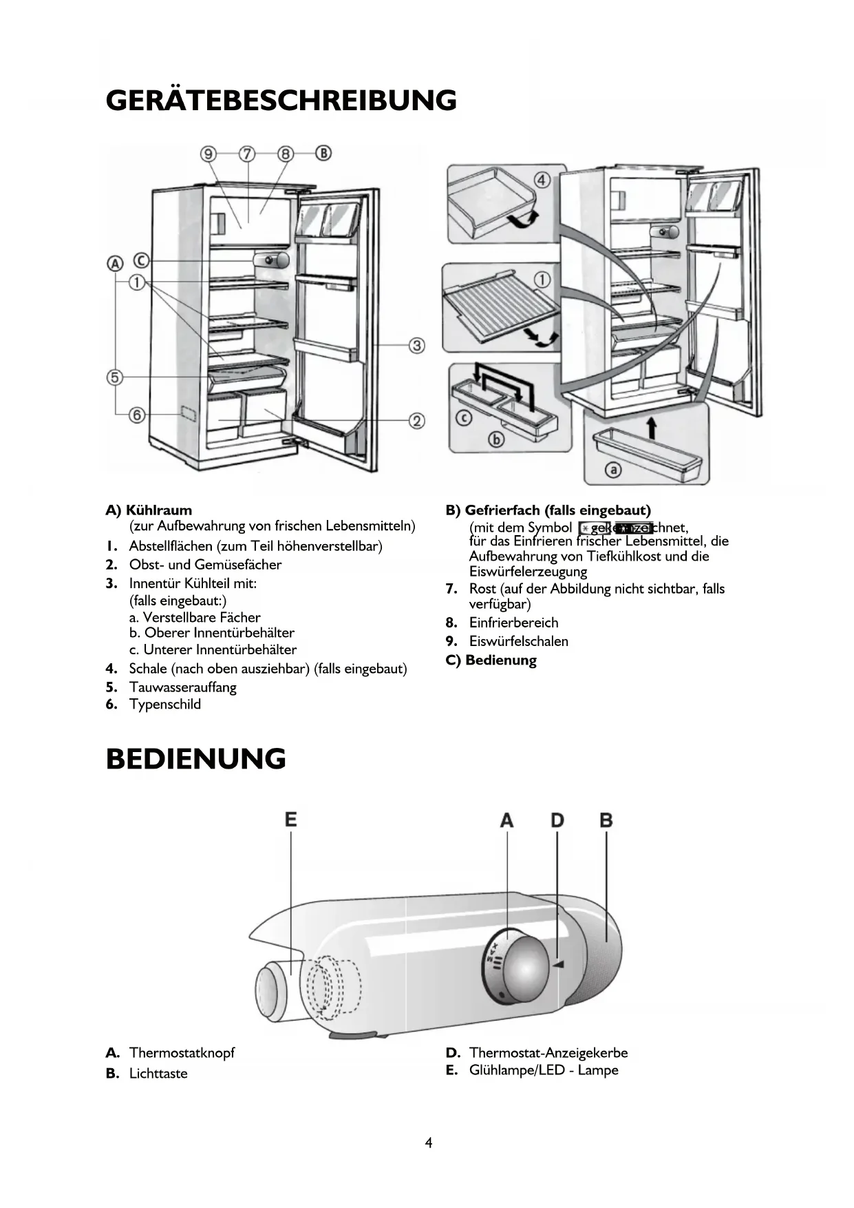 GERÄTEBESCHREIBUNG A) Kühlraum (zur Aufbewahrung von frischen Lebensmitteln)