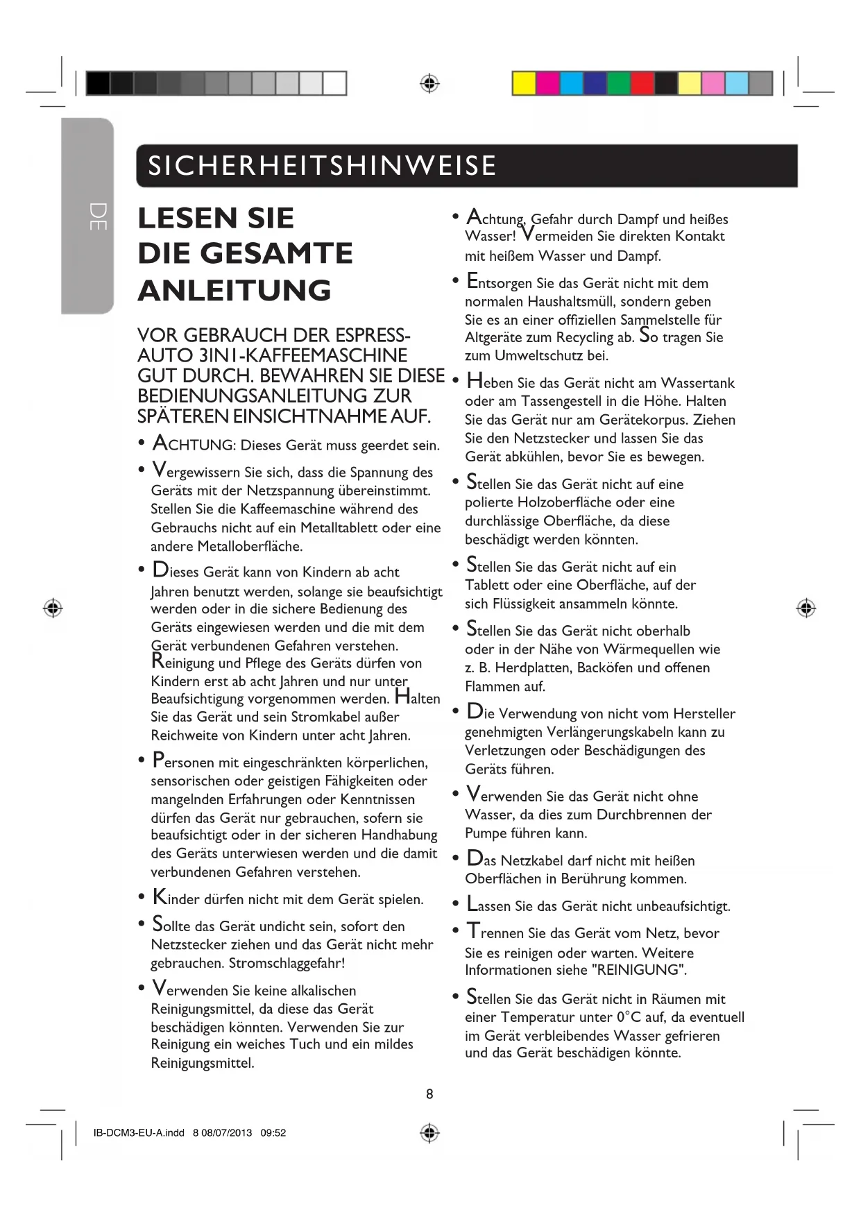 - Stellen Sie das Gerät nicht in Räumen mit einer Temperatur unter 0°C auf, da eventuell im Gerät verbleibendes Wasser gefrieren und das Gerät beschädigen könnte. IB-DCM3-EU-A.indd 8 08/07/2013 09:529