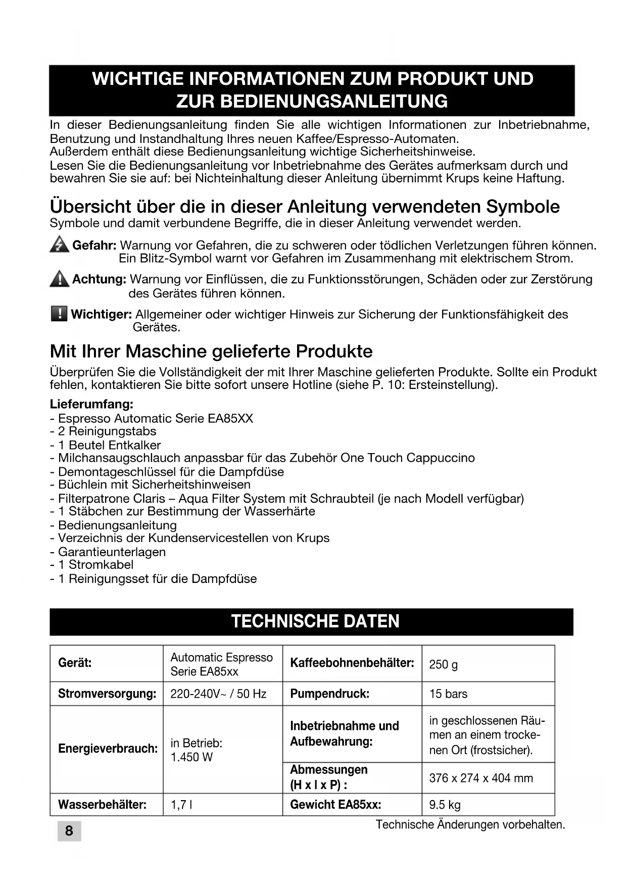 Wir beglückwünschen Sie zum Kauf Ihrer neuen Espresso Automatic Serie EA85XX. Ihre