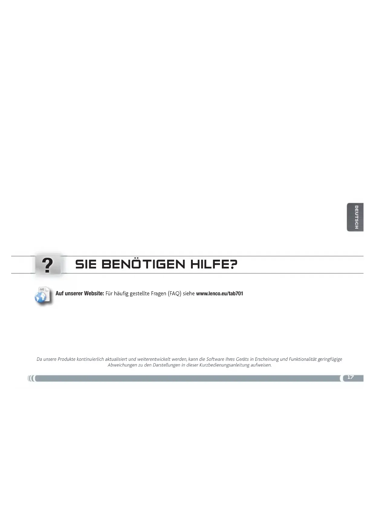 DEUTSCH SIE BENÖTIGEN HILFE? Da unsere Produkte kontinuierlich aktualisiert und weiterentwickelt werden, kann die Software Ihres Geräts in Erscheinung und Funktionalität geringfügige Abweichungen zu den Darstellungen in dieser Kurzbedienungsanleitung aufweisen. Auf unserer Website: Für häufi g gestellte Fragen (FAQ) siehe www.lenco.eu/tab70118