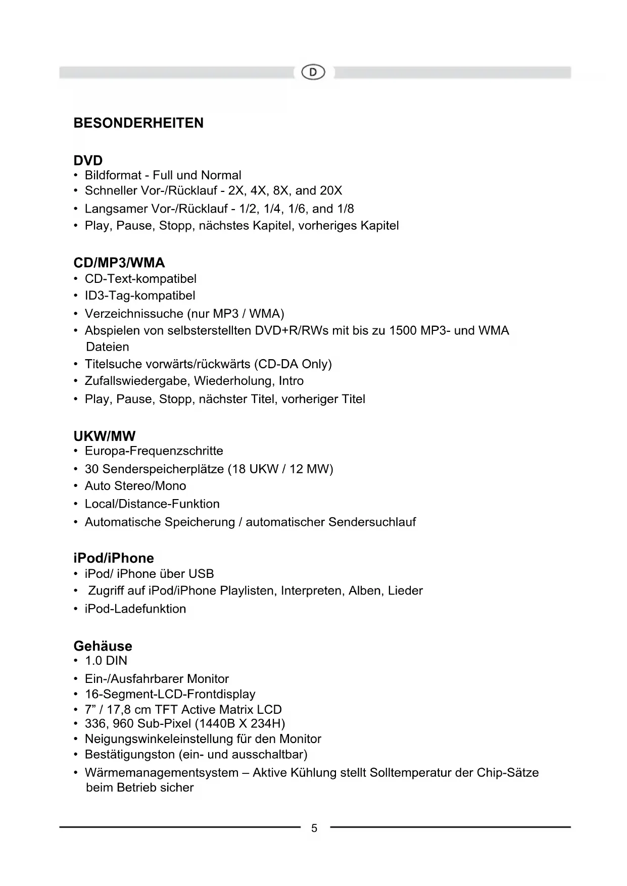 138Danke, dass Sie sich für ein Produkt von Audiovox entschieden haben. Wir hoffen, Ihnen die Funktion des Geräts mit den in dieser Bedienungsanleitung beschriebenen Anweisungen einfach und verständlich erklären zu können. Bitte nehmen Sie sich einige Minuten Zeit um sich mit der Bedienungsanleitung zu befassen. Dieses erleichtert Ihnen dann später die Bedienung des Gerätes. INHALT Besonderheiten 5 Warnhinweise 7 Bedienelemente und Anzeigen 8 Verwenden des TFT-Monitors 10 Bedienung 11 Lenkradfernbedienung 18 Systemeinstellungen19 Radio-Betrieb 26 DVD/VCD-Video-Betrieb 32 DVD/CD-Audio-Betrieb 38 MP3/WMA/Xvid/DivX-Betrieb 42 iPod/iPhone-Betrieb 50 Bluetooth-Betrieb 54 Rückfahrkamera 63 Fehlerbehebung 64 Pege und Wartung 68 Technische Daten 69 4BESONDERHEITEN DVD