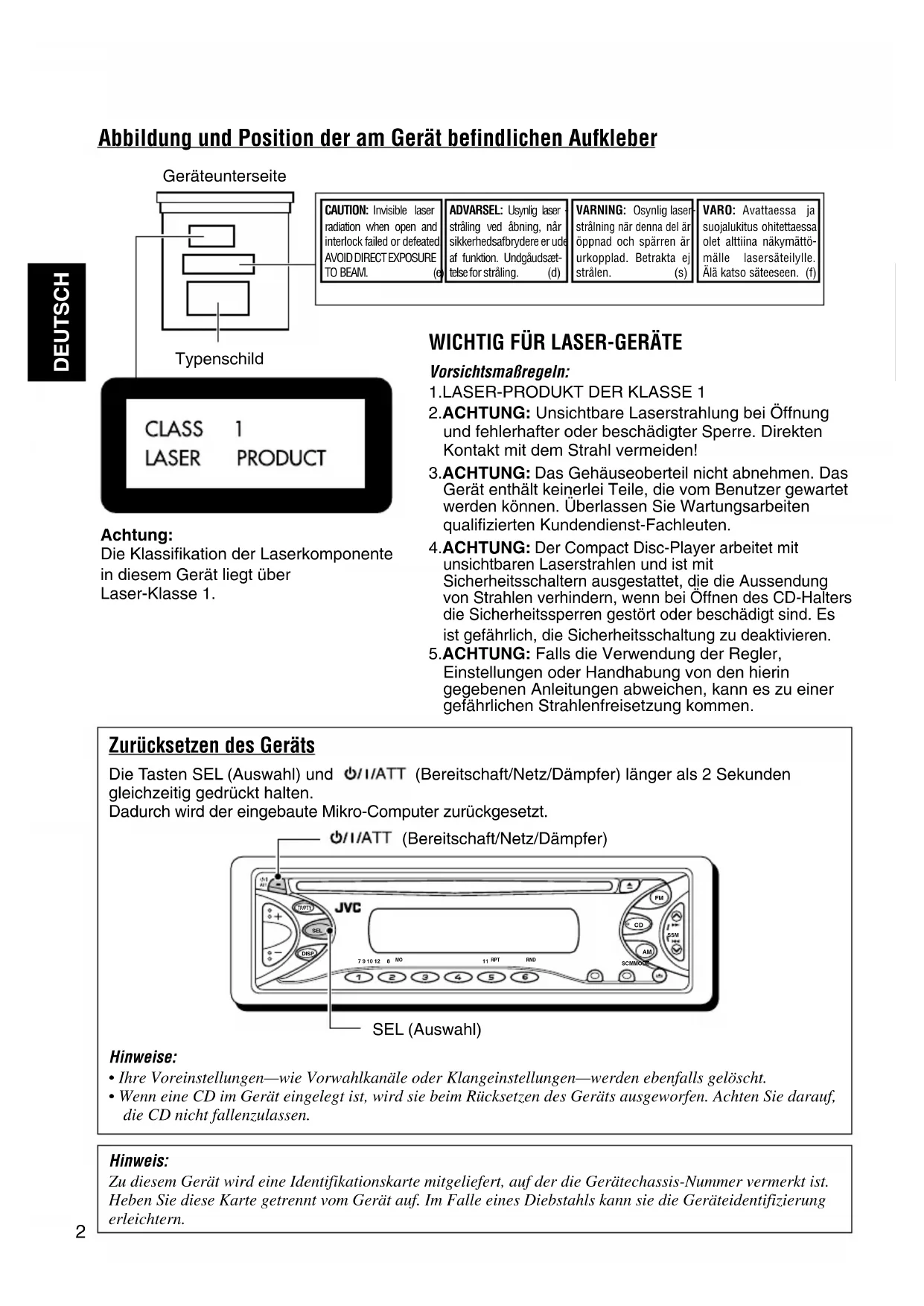 Die Tasten SEL (Auswahl) und (Bereitschaft/Netz/Dämpfer) länger als 2 Sekunden gleichzeitig gedrückt halten.Dadurch wird der eingebaute Mikro-Computer zurückgesetzt. Hinweise: • Ihre Voreinstellungen—wie Vorwahlkanäle oder Klangeinstellungen—werden ebenfalls gelöscht.• Wenn eine CD im Gerät eingelegt ist, wird sie beim Rücksetzen des Geräts ausgeworfen. Achten Sie darauf,die CD nicht fallenzulassen. (Bereitschaft/Netz/Dämpfer)SEL (Auswahl)CAUTION: Invisible laser radiation when open and interlock failed or defeated. AVOID DIRECT EXPOSURETO BEAM. (e)ADVARSEL: Usynlig laser - stråling ved åbning, når sikkerhedsafbrydere er ude af funktion. Undgåudsæt-telse for stråling. (d)VARNING: Osynlig laser-strålning när denna del är öppnad och spärren är urkopplad. Betrakta