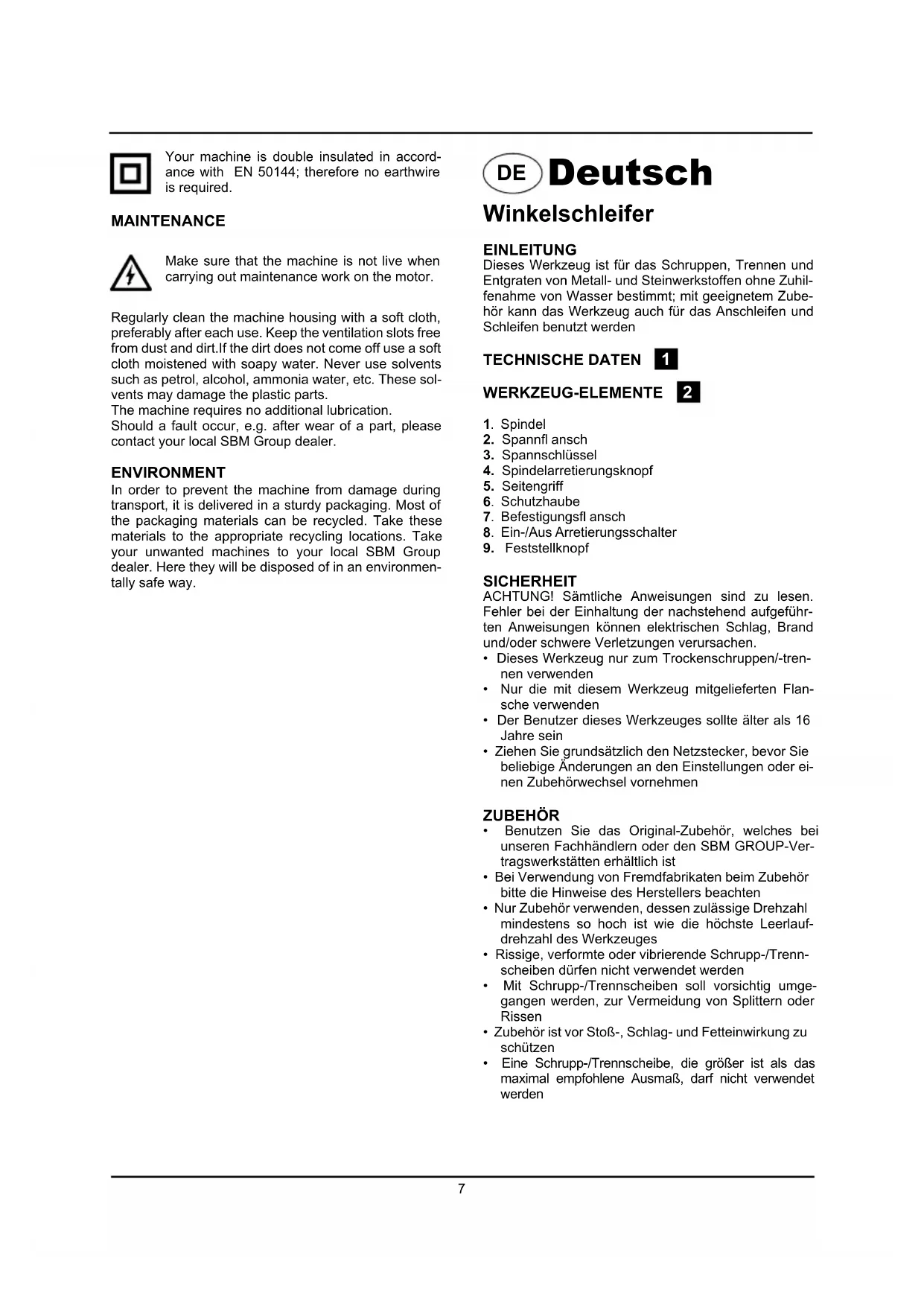 - If for any reason the old plug is cut off the cord of this tool, it must be disposed of safely and not left unattended English7 Your machine is double insulated in accord-ance with EN 50144; therefore no earthwire is required. MAINTENANCE Make sure that the machine is not live when carrying out maintenance work on the motor. Regularly clean the machine housing with a soft cloth, preferably after each use. Keep the ventilation slots free from dust and dirt.If the dirt does not come off use a soft cloth moistened with soapy water. Never use solvents such as petrol, alcohol, ammonia water, etc. These sol-vents may damage the plastic parts.The machine requires no additional lubrication.Should a fault occur, e.g. after wear of a part, please contact your local SBM Group dealer. ENVIRONMENT In order to prevent the machine from damage during transport, it is delivered in a sturdy packaging. Most of the packaging materials can be recycled. Take these materials to the appropriate recycling locations. Take your unwanted machines to your local SBM Group dealer. Here they will be disposed of in an environmen-tally safe way. Winkelschleifer EINLEITUNG Dieses Werkzeug ist für das Schruppen, Trennen und Entgraten von Metall- und Steinwerkstoffen ohne Zuhil-fenahme von Wasser bestimmt; mit geeignetem Zube-hör kann das Werkzeug auch für das Anschleifen und Schleifen benutzt werden TECHNISCHE DATEN 1 WERKZEUG-ELEMENTE 2