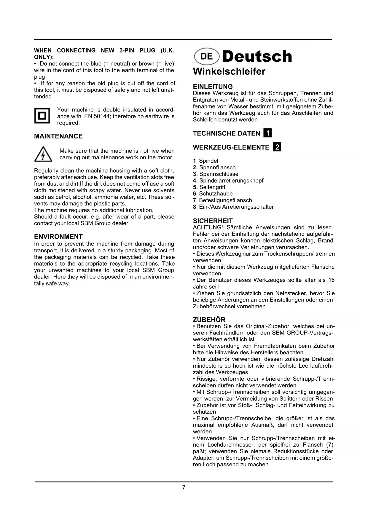 - Zubehör darf nach dem Ausschalten des Antriebes nicht durch seitliches Gegendrücken gebremst werden Die Maschine ist nach EN50144 doppelis- oliert; daher ist Erdung nicht erforderlich. WARTUNG Trennen Sie die Maschine vom Netz, wenn Sie am Mechanismus Wartungsarbeiten aus- führen müssen. Reinigen Sie das Maschinengehäuse regelmäßig mit einem weichen Tuch, vorzugsweise nach jedem Ein- satz. Halten Sie die Lüfterschlitze frei von Staub und Schmutz. Entfernen Sie hartnäckigen Schmutz mit ei- nem weichen Tuch, angefeuchtet mit Seifen wasser. Verwenden Sie keine Lösungsmittel wie Benzin, Alko- hol, Ammonia, usw. Derartige Stoffe beschädigen die Kunststoffteile. Die Maschine braucht keine zusätzliche Schmierung. Wenden Sie sich in Störungsfällen, z.B. durch Ver- schleiß eines Teils, an Ihren örtlichen SBM Group-Ver- tragshändler. UMWELT Um Transportschäden zu verhinderen, wird die Maschi- ne in einer soliden Verpackung geliefert. Die Verpac- kung besteht weitgehend aus verwertbarem Material. Benutzen Sie also die Möglichkeit zum Recyclen der Verpackung. Bringen Sie bei Ersatz die alten Maschi- nen zu Ihren örtlichen SBM Group-Vertagshändler. Er wird sich um eine umweltfreundliche Verarbeitung ïhrer alten Maschine bemühen.9 Meuleuse d’angle INTRODUCTION Cet outil sert au meulage, au tronçonnage et à l’ébar- bage de pièces en métal et en pierre sans utiliser de l’eau; combiné avec des accessoires spécifi ques, cet outil peut également servir au brossage et au ponçage SPECIFICATIONS TECHNIQUES 1