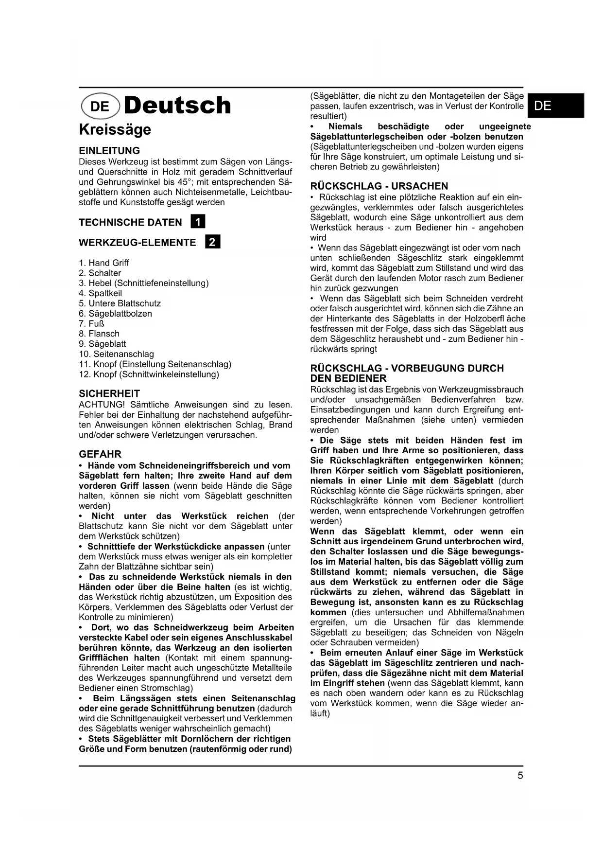- Wenn das Sägeblatt eingezwängt ist oder vom nach unten schließenden Sägeschlitz stark eingeklemmt wird, kommt das Sägeblatt zum Stillstand und wird das Gerät durch den laufenden Motor rasch zum Bediener hin zurück gezwungen• Wenn das Sägeblatt sich beim Schneiden verdreht oder falsch ausgerichtet wird, können sich die Zähne an der Hinterkante des Sägeblatts in der Holzoberfl äche festfressen mit der Folge, dass sich das Sägeblatt aus dem Sägeschlitz heraushebt und - zum Bediener hin - rückwärts springtRÜCKSCHLAG - VORBEUGUNG DURCH DEN BEDIENERRückschlag ist das Ergebnis von Werkzeugmissbrauch und/oder unsachgemäßen Bedienverfahren bzw. Einsatzbedingungen und kann durch Ergreifung ent-sprechender Maßnahmen (siehe unten) vermieden werden• Die Säge stets mit beiden Händen fest im Griff haben und Ihre Arme so positionieren, dass Sie Rückschlagkräften entgegenwirken können; Ihren Körper seitlich vom Sägeblatt positionieren, niemals in einer Linie mit dem Sägeblatt (durch Rückschlag könnte die Säge rückwärts springen, aber Rückschlagkräfte können vom Bediener kontrolliert werden, wenn entsprechende Vorkehrungen getroffen werden)Wenn das Sägeblatt klemmt, oder wenn ein Schnitt aus irgendeinem Grund unterbrochen wird, den Schalter loslassen und die Säge bewegungs-los im Material halten, bis das Sägeblatt völlig zum Stillstand kommt; niemals versuchen, die Säge aus dem Werkstück zu entfernen oder die Säge rückwärts zu ziehen, während das Sägeblatt in Bewegung ist, ansonsten kann es zu Rückschlag kommen (dies untersuchen und Abhilfemaßnahmen ergreifen, um die Ursachen für das klemmende Sägeblatt zu beseitigen; das Schneiden von Nägeln oder Schrauben vermeiden)• Beim erneuten Anlauf einer Säge im Werkstück das Sägeblatt im Sägeschlitz zentrieren und nach-prüfen, dass die Sägezähne nicht mit dem Material im Eingriff stehen (wenn das Sägeblatt klemmt, kann es nach oben wandern oder kann es zu Rückschlag vom Werkstück kommen, wenn die Säge wieder an-läuft) Kreissäge EINLEITUNGDieses Werkzeug ist bestimmt zum Sägen von Längs- und Querschnitte in Holz mit geradem Schnittverlauf und Gehrungswinkel bis 45°; mit entsprechenden Sä-geblättern können auch Nichteisenmetalle, Leichtbau-stoffe und Kunststoffe gesägt werdenTECHNISCHE DATEN 1 WERKZEUG-ELEMENTE 2 1. Hand Griff2. Schalter3. Hebel (Schnittiefeneinstellung)4. Spaltkeil5. Untere Blattschutz6. Sägeblattbolzen7. Fuß8. Flansch9. Sägeblatt10. Seitenanschlag11. Knopf (Einstellung Seitenanschlag)12. Knopf (Schnittwinkeleinstellung)SICHERHEITACHTUNG! Sämtliche Anweisungen sind zu lesen. Fehler bei der Einhaltung der nachstehend aufgeführ-ten Anweisungen können elektrischen Schlag, Brand und/oder schwere Verletzungen verursachen. GEFAHR• Hände vom Schneideneingriffsbereich und vom Sägeblatt fern halten; Ihre zweite Hand auf dem vorderen Griff lassen (wenn beide Hände die Säge halten, können sie nicht vom Sägeblatt geschnitten werden)• Nicht unter das Werkstück reichen (der Blattschutz kann Sie nicht vor dem Sägeblatt unter dem Werkstück schützen)• Schnitttiefe der Werkstückdicke anpassen (unter dem Werkstück muss etwas weniger als ein kompletter Zahn der Blattzähne sichtbar sein)• Das zu schneidende Werkstück niemals in den Händen oder über die Beine halten (es ist wichtig, das Werkstück richtig abzustützen, um Exposition des Körpers, Verklemmen des Sägeblatts oder Verlust der Kontrolle zu minimieren)• Dort, wo das Schneidwerkzeug beim Arbeiten versteckte Kabel oder sein eigenes Anschlusskabel berühren könnte, das Werkzeug an den isolierten Grifffl ächen halten (Kontakt mit einem spannung- führenden Leiter macht auch ungeschützte Metallteile des Werkzeuges spannungführend und versetzt dem Bediener einen Stromschlag)• Beim Längssägen stets einen Seitenanschlag oder eine gerade Schnittführung benutzen (dadurch wird die Schnittgenauigkeit verbessert und Verklemmen des Sägeblatts weniger wahrscheinlich gemacht)• Stets Sägeblätter mit Dornlöchern der richtigen Größe und Form benutzen (rautenförmig oder rund)
