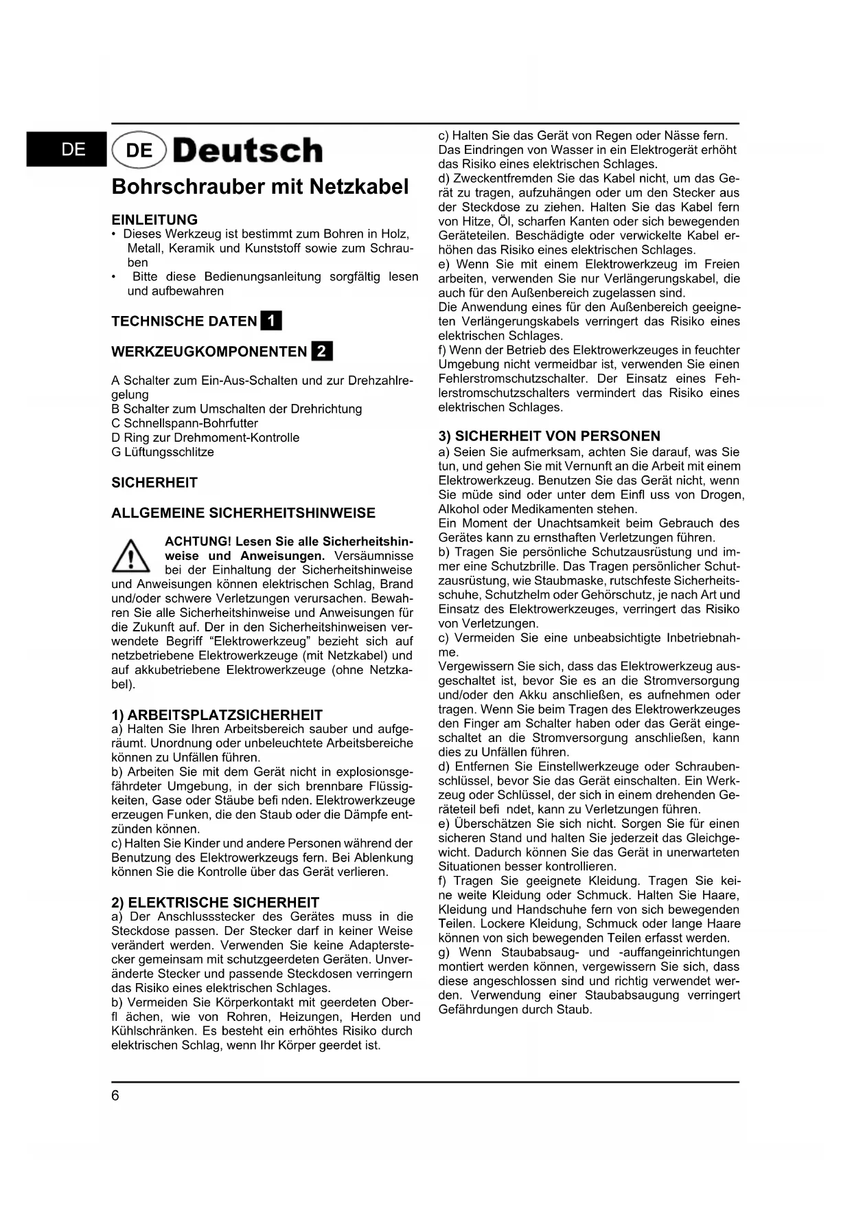 - Bitte diese Bedienungsanleitung sorgfältig lesen und aufbewahren TECHNISCHE DATEN 1 WERKZEUGKOMPONENTEN 2 A Schalter zum Ein-Aus-Schalten und zur Drehzahlre-gelungB Schalter zum Umschalten der DrehrichtungC Schnellspann-BohrfutterD Ring zur Drehmoment-KontrolleG Lüftungsschlitze SICHERHEIT ALLGEMEINE SICHERHEITSHINWEISE ACHTUNG! Lesen Sie alle Sicherheitshin-weise und Anweisungen. Versäumnisse bei der Einhaltung der Sicherheitshinweise und Anweisungen können elektrischen Schlag, Brand und/oder schwere Verletzungen verursachen. Bewah-ren Sie alle Sicherheitshinweise und Anweisungen für die Zukunft auf. Der in den Sicherheitshinweisen ver-wendete Begriff “Elektrowerkzeug” bezieht sich auf netzbetriebene Elektrowerkzeuge (mit Netzkabel) und auf akkubetriebene Elektrowerkzeuge (ohne Netzka-bel).