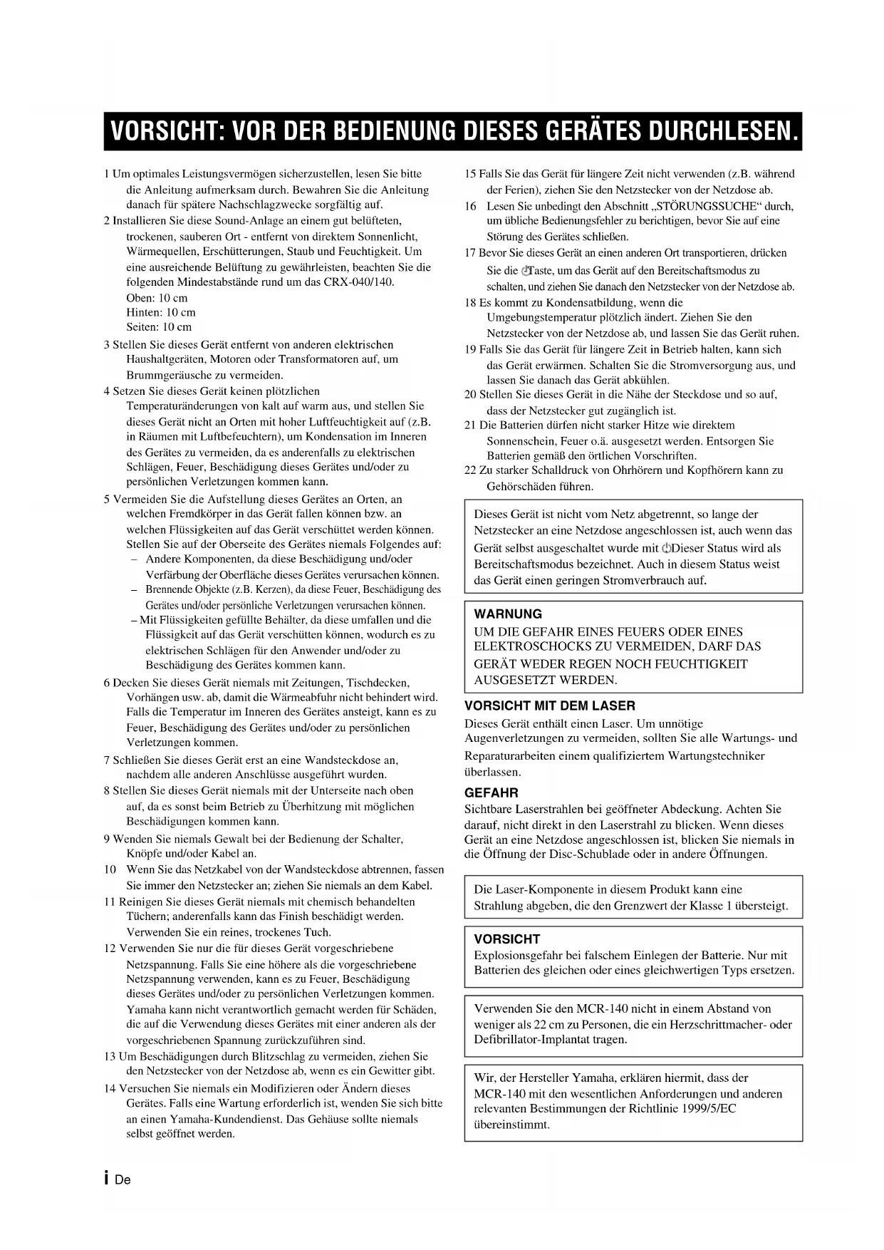 BEDIENUNGSANLEITUNG MCR040 YAMAHA