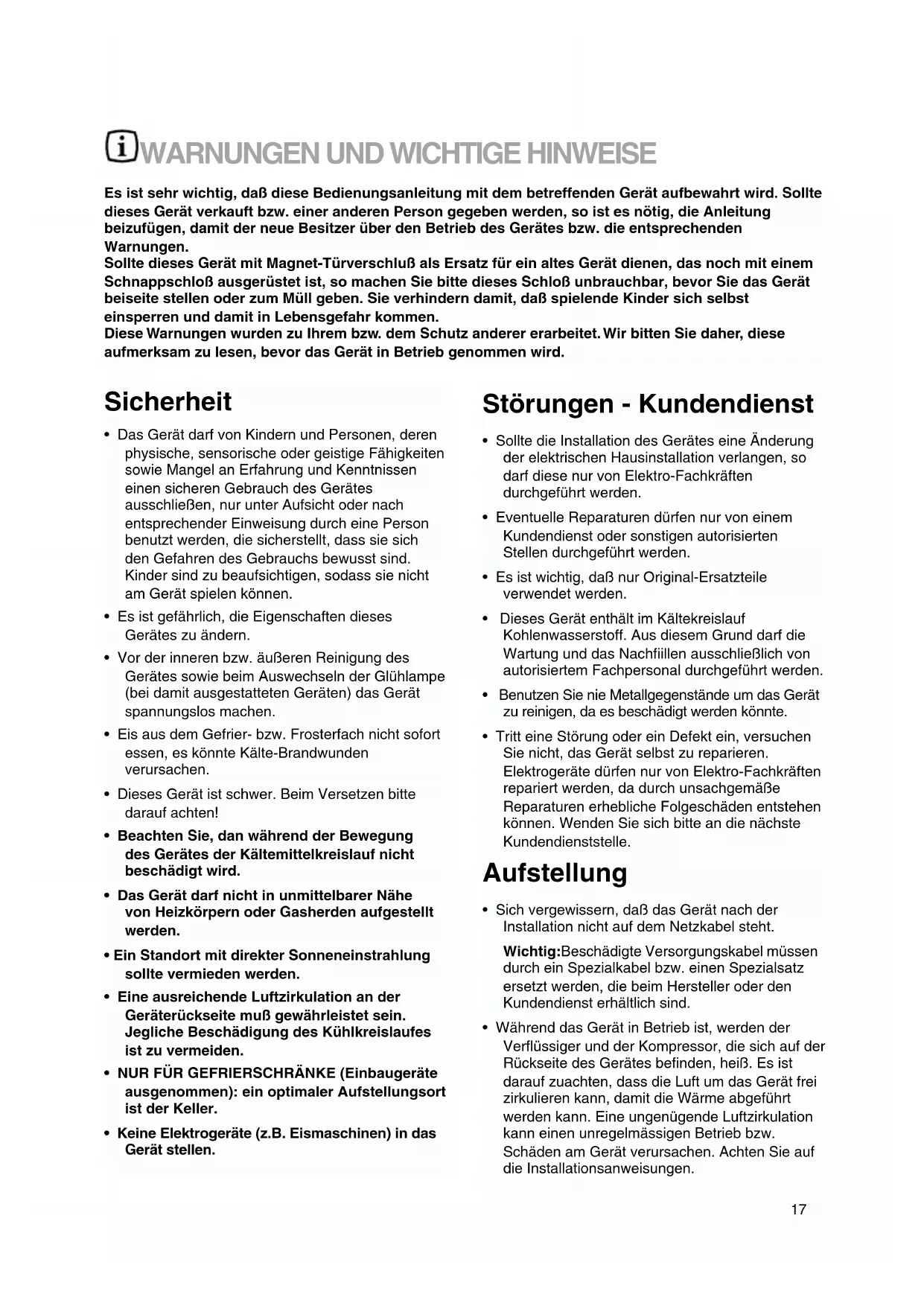 Wartung, oder Nicht-Beachtung der Aufstellungs- und Installationshinweise sind durch die Garantie nicht