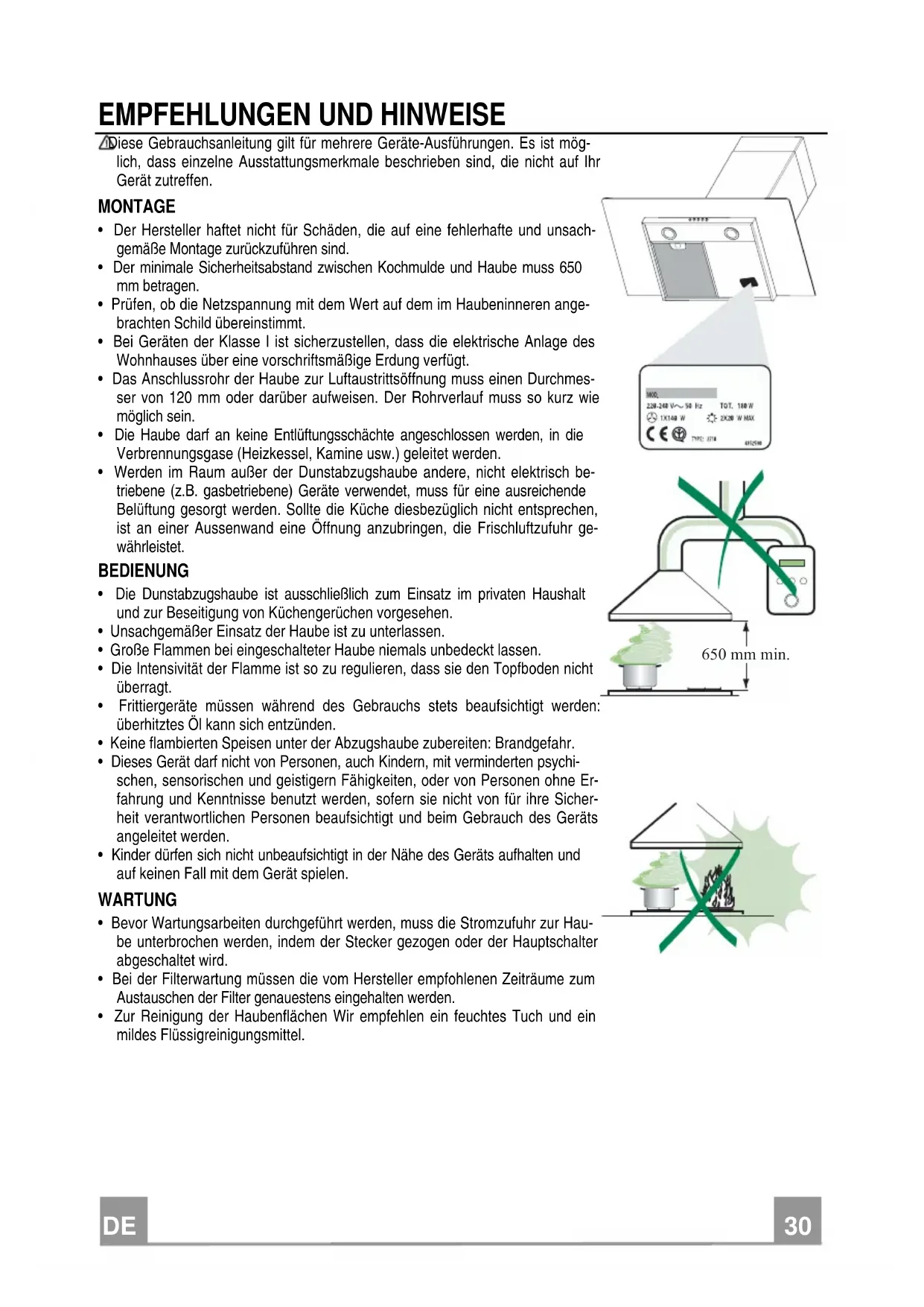 EMPFEHLUNGEN UND HINWEISE Diese Gebrauchsanleitung gilt für mehrere Geräte-Ausführungen. Es ist mög-lich, dass einzelne Ausstattungsmerkmale beschrieben sind, die nicht auf Ihr Gerät zutreffen. MONTAGE • Der Hersteller haftet nicht für Schäden, die auf eine fehlerhafte und unsach-gemäße Montage zurückzuführen sind. • Der minimale Sicherheitsabstand zwischen Kochmulde und Haube muss 650 mm betragen. • Prüfen, ob die Netzspannung mit dem Wert auf dem im Haubeninneren ange-brachten Schild übereinstimmt. • Bei Geräten der Klasse I ist sicherzustellen, dass die elektrische Anlage des Wohnhauses über eine vorschriftsmäßige Erdung verfügt. • Das Anschlussrohr der Haube zur Luftaustrittsöffnung muss einen Durchmes-ser von 120 mm oder darüber aufweisen. Der Rohrverlauf muss so kurz wie möglich sein. • Die Haube darf an keine Entlüftungsschächte angeschlossen werden, in die Verbrennungsgase (Heizkessel, Kamine usw.) geleitet werden. • Werden im Raum außer der Dunstabzugshaube andere, nicht elektrisch be-triebene (z.B. gasbetriebene) Geräte verwendet, muss für eine ausreichende Belüftung gesorgt werden. Sollte die Küche diesbezüglich nicht entsprechen, ist an einer Aussenwand eine Öffnung anzubringen, die Frischluftzufuhr ge-währleistet. BEDIENUNG • Die Dunstabzugshaube ist ausschließlich zum Einsatz im privaten Haushalt und zur Beseitigung von Küchengerüchen vorgesehen. • Unsachgemäßer Einsatz der Haube ist zu unterlassen. • Große Flammen bei eingeschalteter Haube niemals unbedeckt lassen. • Die Intensivität der Flamme ist so zu regulieren, dass sie den Topfboden nicht überragt. • Frittiergeräte müssen während des Gebrauchs stets beaufsichtigt werden: überhitztes Öl kann sich entzünden. • Keine flambierten Speisen unter der Abzugshaube zubereiten: Brandgefahr. • Dieses Gerät darf nicht von Personen, auch Kindern, mit verminderten psychi-schen, sensorischen und geistigern Fähigkeiten, oder von Personen ohne Er-fahrung und Kenntnisse benutzt werden, sofern sie nicht von für ihre Sicher-heit verantwortlichen Personen beaufsichtigt und beim Gebrauch des Geräts angeleitet werden. • Kinder dürfen sich nicht unbeaufsichtigt in der Nähe des Geräts aufhalten und auf keinen Fall mit dem Gerät spielen. WARTUNG • Bevor Wartungsarbeiten durchgeführt werden, muss die Stromzufuhr zur Hau-be unterbrochen werden, indem der Stecker gezogen oder der Hauptschalter abgeschaltet wird. • Bei der Filterwartung müssen die vom Hersteller empfohlenen Zeiträume zum Austauschen der Filter genauestens eingehalten werden. • Zur Reinigung der Haubenflächen Wir empfehlen ein feuchtes Tuch und ein mildes Flüssigreinigungsmittel.