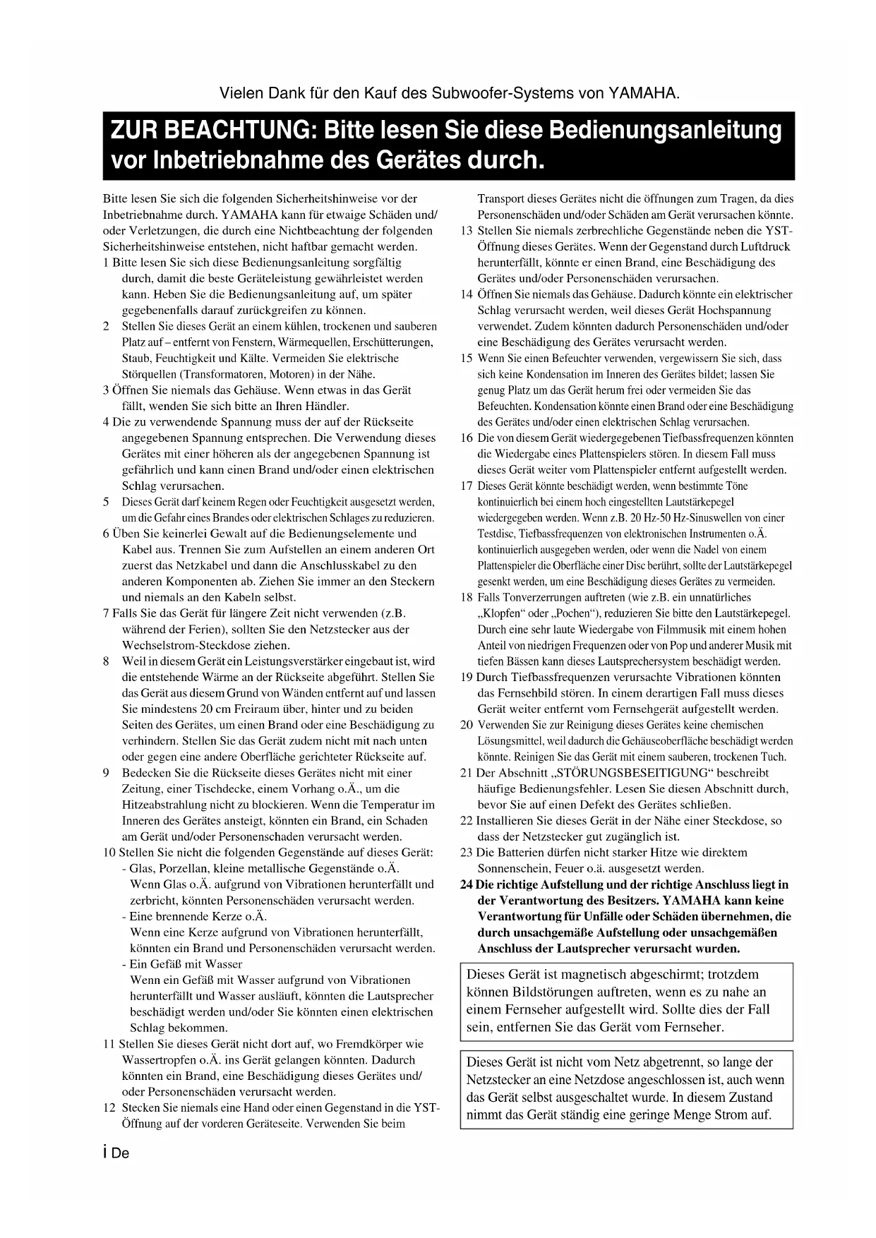 Vielen Dank für den Kauf des Subwoofer-Systems von YAMAHA.