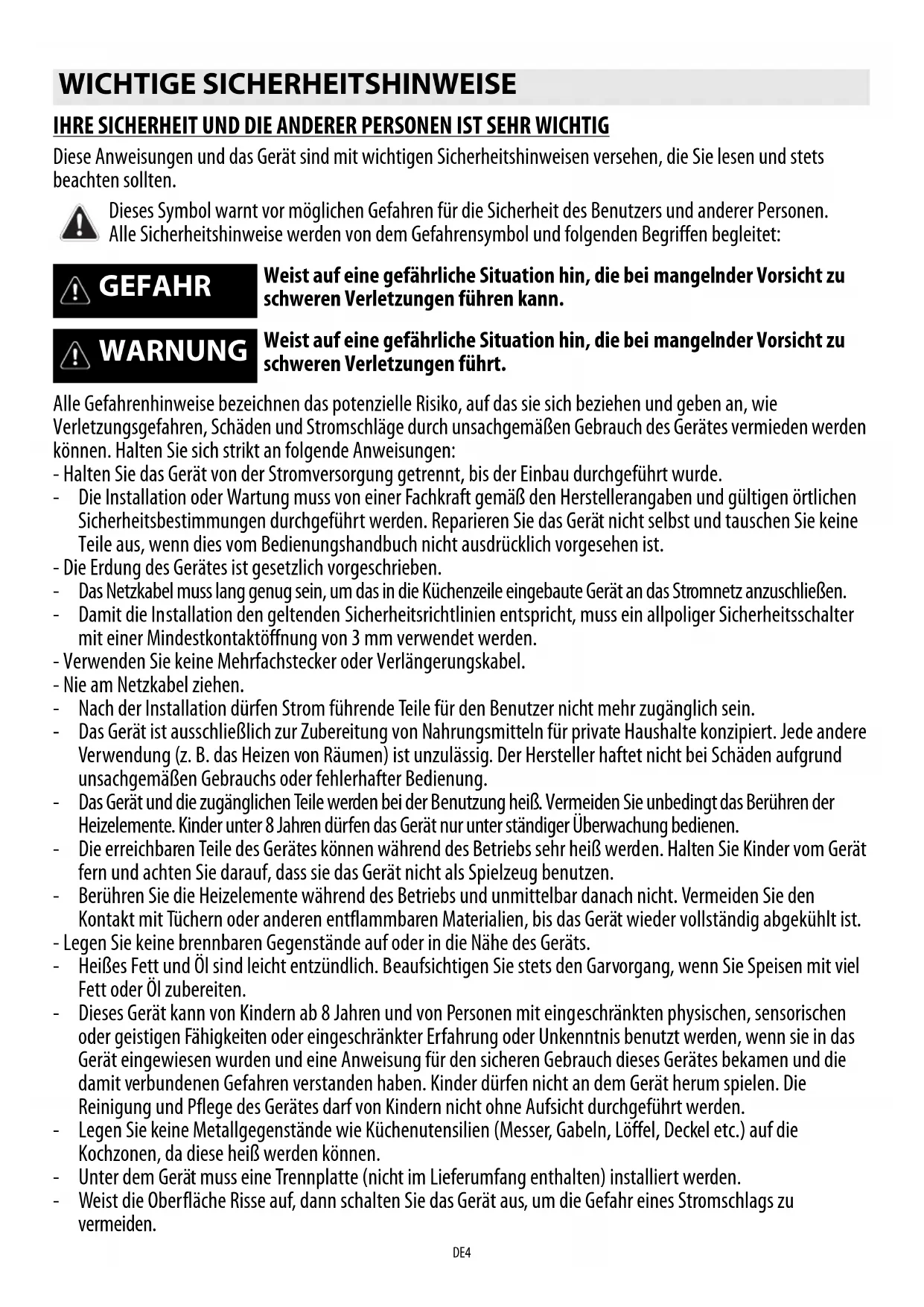 Min. 5 mm Min. 10 cm Min. 3 cmMax. 6 cm Min. 5 mm X 4DE4 IHRE SICHERHEIT UND DIE ANDERER PERSONEN IST SEHR WICHTIG Diese Anweisungen und das Gerät sind mit wichtigen Sicherheitshinweisen versehen, die Sie lesen und stets beachten sollten. Alle Gefahrenhinweise bezeichnen das potenzielle Risiko, auf das sie sich beziehen und geben an, wie Verletzungsgefahren, Schäden und Stromschläge durch unsachgemäßen Gebrauch des Gerätes vermieden werden können. Halten Sie sich strikt an folgende Anweisungen: - Halten Sie das Gerät von der Stromversorgung getrennt, bis der Einbau durchgeführt wurde. - Die Installation oder Wartung muss von einer Fachkraft gemäß den Herstellerangaben und gültigen örtlichen Sicherheitsbestimmungen durchgeführt werden. Reparieren Sie das Gerät nicht selbst und tauschen Sie keine Teile aus, wenn dies vom Bedienungshandbuch nicht ausdrücklich vorgesehen ist. - Die Erdung des Gerätes ist gesetzlich vorgeschrieben. - Das Netzkabel muss lang genug sein, um das in die Küchenzeile eingebaute Gerät an das Stromnetz anzuschließen. - Damit die Installation den geltenden Sicherheitsrichtlinien entspricht, muss ein allpoliger Sicherheitsschalter mit einer Mindestkontaktöffnung von 3 mm verwendet werden. - Verwenden Sie keine Mehrfachstecker oder Verlängerungskabel. - Nie am Netzkabel ziehen. - Nach der Installation dürfen Strom führende Teile für den Benutzer nicht mehr zugänglich sein. - Das Gerät ist ausschließlich zur Zubereitung von Nahrungsmitteln für private Haushalte konzipiert. Jede andere Verwendung (z. B. das Heizen von Räumen) ist unzulässig. Der Hersteller haftet nicht bei Schäden aufgrund unsachgemäßen Gebrauchs oder fehlerhafter Bedienung. - Das Gerät und die zugänglichen Teile werden bei der Benutzung heiß. Vermeiden Sie unbedingt das Berühren der Heizelemente. Kinder unter 8 Jahren dürfen das Gerät nur unter ständiger Überwachung bedienen. - Die erreichbaren Teile des Gerätes können während des Betriebs sehr heiß werden. Halten Sie Kinder vom Gerät fern und achten Sie darauf, dass sie das Gerät nicht als Spielzeug benutzen. - Berühren Sie die Heizelemente während des Betriebs und unmittelbar danach nicht. Vermeiden Sie den Kontakt mit Tüchern oder anderen entflammbaren Materialien, bis das Gerät wieder vollständig abgekühlt ist. - Legen Sie keine brennbaren Gegenstände auf oder in die Nähe des Geräts. - Heißes Fett und Öl sind leicht entzündlich. Beaufsichtigen Sie stets den Garvorgang, wenn Sie Speisen mit viel Fett oder Öl zubereiten. - Dieses Gerät kann von Kindern ab 8 Jahren und von Personen mit eingeschränkten physischen, sensorischen oder geistigen Fähigkeiten oder eingeschränkter Erfahrung oder Unkenntnis benutzt werden, wenn sie in das Gerät eingewiesen wurden und eine Anweisung für den sicheren Gebrauch dieses Gerätes bekamen und die damit verbundenen Gefahren verstanden haben. Kinder dürfen nicht an dem Gerät herum spielen. Die Reinigung und Pflege des Gerätes darf von Kindern nicht ohne Aufsicht durchgeführt werden. - Legen Sie keine Metallgegenstände wie Küchenutensilien (Messer, Gabeln, Löffel, Deckel etc.) auf die Kochzonen, da diese heiß werden können. - Unter dem Gerät muss eine Trennplatte (nicht im Lieferumfang enthalten) installiert werden. - Weist die Oberfläche Risse auf, dann schalten Sie das Gerät aus, um die Gefahr eines Stromschlags zu vermeiden. WICHTIGE SICHERHEITSHINWEISE Dieses Symbol warnt vor möglichen Gefahren für die Sicherheit des Benutzers und anderer Personen. Alle Sicherheitshinweise werden von dem Gefahrensymbol und folgenden Begriffen begleitet: GEFAHR Weist auf eine gefährliche Situation hin, die bei mangelnder Vorsicht zu schweren Verletzungen führen kann. WARNUNG Weist auf eine gefährliche Situation hin, die bei mangelnder Vorsicht zu schweren Verletzungen führt. DEUTSCH Installation Seite 2 Bedienungsanleitung SeiteDE5 - Das Gerät ist nicht für den Betrieb mittels externer Zeitschaltuhr oder getrenntem Fernbedienungssystem vorgesehen. - Lassen Sie Speisen, die mit Öl oder Fett zubereitet werden, niemals unbeaufsichtigt auf dem Herd stehen, denn dies ist gefährlich und kann zu einem Brand führen. Versuchen Sie NIEMALS, einen Brand mit Wasser zu löschen, sondern schalten Sie das Gerät aus und decken Sie die Flamme mit einem Deckel oder einer speziellen Brandschutzdecke ab. Brandgefahr: stellen Sie keine Gegenstände auf den Kochflächen ab. - Verwenden Sie keine Dampfstrahlreiniger! - Metallgegenstände wie Messer, Gabeln, Löffel und Deckel sollten nicht auf die Oberfläche des Kochfelds gelegt werden, da sie heiß werden können. - Schalten Sie das Kochfeld nach der Benutzung mit den Bedienelementen aus und verlassen Sie sich nicht allein auf die Topferkennung.DE6 Entsorgung von Verpackungsmaterialien Das Verpackungsmaterial ist zu 100 % wiederverwertbar und trägt das Recycling-Symbol ( ). Werfen Sie das Verpackungsmaterial deshalb nicht einfach fort, sondern entsorgen Sie es auf die von den verantwortlichen Stellen festgelegte Weise. Entsorgung von Altgeräten Dieses Gerät ist gemäß der Europäischen Richtlinie 2002/96/EG für Elektro- und Elektronik-Altgeräte gekennzeichnet. Durch eine angemessene Entsorgung des Geräts trägt der Nutzer dazu bei, potentiell schädliche Auswirkungen für Umwelt und Gesundheit zu vermeiden. Das Symbol auf dem Gerät bzw. auf dem beiliegenden Informationsmaterial weist darauf hin, dass dieses Gerät kein normaler Haushaltsabfall ist, sondern in einer Sammelstelle für Elektro- und Elektronik-Altgeräte entsorgt werden muss. Energiesparen Für bestmögliche Ergebnisse berücksichtigen Sie bitte folgende Hinweise:
