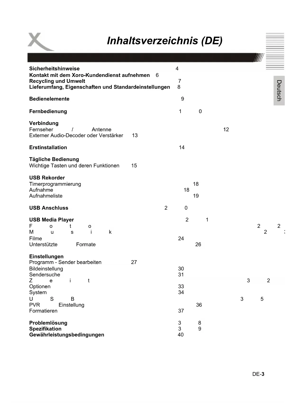 HRT 7515DE-3 Deutsch Inhaltsverzeichnis (DE) Sicherheitshinweise 4 Kontakt mit dem Xoro-Kundendienst aufnehmen 6 Recycling und Umwelt 7 Lieferumfang, Eigenschaften und Standardeinstellungen 8 Bedienelemente 9 Fernbedienung 10 Verbindung Fernseher / Antenne 12 Externer Audio-Decoder oder Verstärker 13 Erstinstallation 14 Tägliche Bedienung Wichtige Tasten und deren Funktionen 15 USB Rekorder Timerprogrammierung 18 Aufnahme 18 Aufnahmeliste 19 USB Anschluss 20 USB Media Player 21 Foto 22 Musik 23 Filme 24 Unterstützte Formate 26 Einstellungen Programm - Sender bearbeiten 27 Bildeinstellung 30 Sendersuche 31 Zeit 32 Optionen 33 System 34 USB 35 PVR Einstellung 36 Formatieren 37 Problemlösung 38 Spezifikation 39 Gewährleistungsbedingungen 40DE-4 Deutsch Sicherheitshinweise Das Blitzsymbol im Dreieck weist den Benutzer auf gefährliche Spannungen" an einigen freiliegenden Bauteilen im Inneren des Gerätes hin. Das Ausrufezeichen im Dreieck weist den Benutzer auf wichtige Bedienungs- und Wartungsanweisungen (Service) in diesem Handbuch hin, die unbedingt befolgt werden sollten. Das Gerät wurde getestet und entspricht lt. FCC Norm den Standards eines Klasse B Gerätes. Diese Standards wurden entwickelt um Interferenzen mit anderen heimi- schen Elektrogeräten zu vermeiden bzw. zu reduzieren. Dieses Gerät kann Radio- wellen verursachen und ist es nicht wie in der Anleitung vorgeschrieben installiert, kann es zu Störungen des Radios oder Fernsehers, zum Beispiel beim Ein- oder Ausschalten des Gerätes kommen. Bedienungsanleitung
