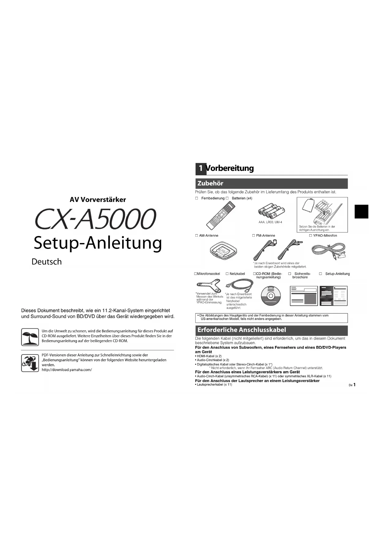 Um die Umwelt zu schonen, wird die Bedienungsanleitung für dieses Produkt auf CD-ROM ausgeliefert. Weitere Einzelheiten über dieses Produkt finden Sie in der Bedienungsanleitung auf der beiliegenden CD-ROM.PDF-Versionen dieser Anleitung zur Schnelleinrichtung sowie der „Bedienungsanleitung“ können von der folgenden Website heruntergeladen werden.http://download.yamaha.com/ Setup-Anleitung
