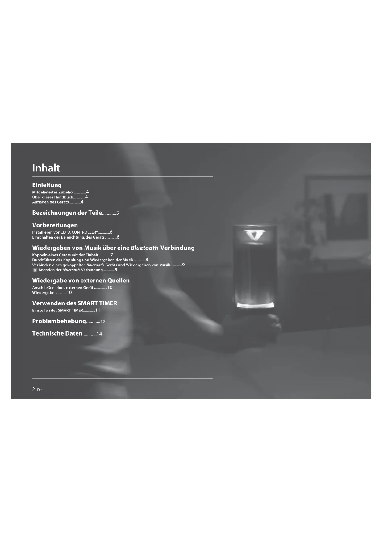 • Achten Sie darauf, dass Sie den SMART TIMER jedes Mal mit der Einheit synchronisieren, wenn Sie eine SMART TIMER-Einstellung vornehmen. Einschalt-Timer Ausschalt-Timer• Einschalten der Beleuchtung zur eingestellten Zeit.• Festlegen der Helligkeit der Beleuchtung.• Wiedergeben der Musik von einem angeschlossenen Gerät zur eingestellten Zeit.• Auswählen eines Titels.• Einstellen des Lautstärkepegels.• Ausschalten der Beleuchtung zur eingestellten Zeit.• Ausschalten der Einheit zur eingestellten Zeit.Technische Daten und Aussehen können aufgrund von Produktverbesserungen ohne Vorankündigung geändert werden. • Um einen Titel über eine Bluetooth-Verbindung zu einer eingestellten Zeit wiederzugeben, muss die Bluetooth-Funktion Ihres Smartphones oder Tablet aktiviert sein. Im Fall eines iPhone dürfen Sie außerdem beim Multitasking DTA CONTROLLER nicht schließen. • Wenn ein anderes Bluetooth-Gerät zum Zeitpunkt der Einrichtung mit der Einheit verbunden ist, wird der Titel, den Sie als Einschalt-Timer eingestellt haben, nicht wiedergegeben. Trennen Sie mögliche andere Geräte vor der eingestellten Zeit.• Der Einschalt- und Ausschalt-Timer des SMART TIMER können nur über DTA CONTROLLER aktiviert/deaktiviert werden.Innere Uhr der Einheit• Die Einheit kopiert die Uhrzeit von DTA CONTROLLER in die innere Uhr der Einheit, wenn ein Gerät über eine Bluetooth-Verbindung mit der Einheit verbunden ist. Der SMART TIMER folgt der inneren Uhr der Einheit.• Wenn Sie das Netzteil trennen und die verbleibende Akkuleistung vollständig erschöpft ist, wird die Uhreinstellung zurückgesetzt und SMART TIMER wird deaktiviert.12 De