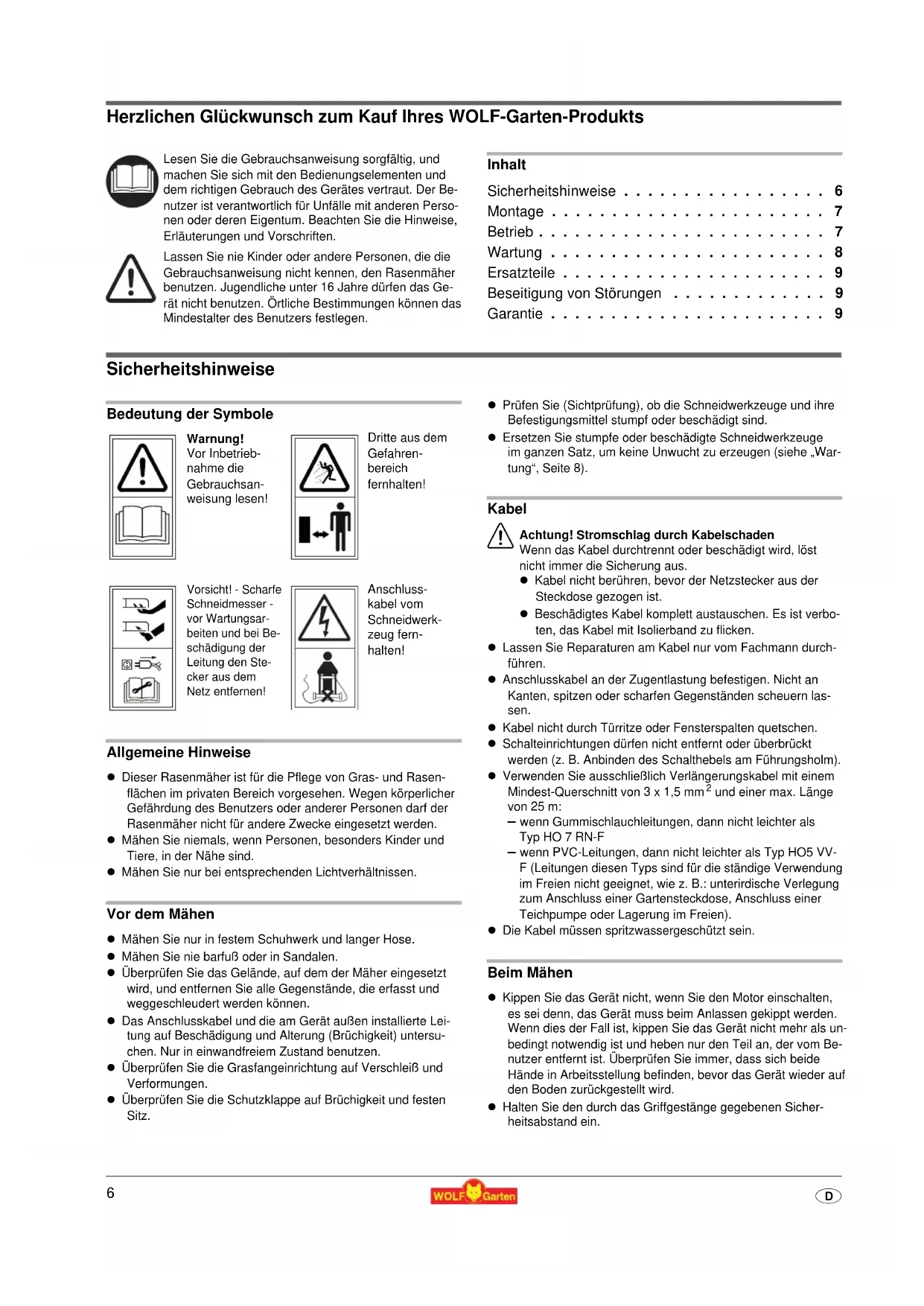 - Garantie Sicherheitshinweise Bedeutung der Symbole Allgemeine Hinweise Dieser Rasenmäher ist für die Pflege von Gras- und Rasen- flächen im privaten Bereich vorgesehen. Wegen körperlicher Gefährdung des Benutzers oder anderer Personen darf der Rasenmäher nicht für andere Zwecke eingesetzt werden. Mähen Sie niemals, wenn Personen, besonders Kinder und Tiere, in der Nähe sind. Mähen Sie nur bei entsprechenden Lichtverhältnissen. Vor dem Mähen Mähen Sie nur in festem Schuhwerk und langer Hose. Mähen Sie nie barfuß oder in Sandalen. Überprüfen Sie das Gelände, auf dem der Mäher eingesetzt wird, und entfernen Sie alle Gegenstände, die erfasst und weggeschleudert werden können. Das Anschlusskabel und die am Gerät außen installierte Lei- tung auf Beschädigung und Alterung (Brüchigkeit) untersu- chen. Nur in einwandfreiem Zustand benutzen. Überprüfen Sie die Grasfangeinrichtung auf Verschleiß und Verformungen. Überprüfen Sie die Schutzklappe auf Brüchigkeit und festen Sitz. Prüfen Sie (Sichtprüfung), ob die Schneidwerkzeuge und ihre Befestigungsmittel stumpf oder beschädigt sind. Ersetzen Sie stumpfe oder beschädigte Schneidwerkzeuge im ganzen Satz, um keine Unwucht zu erzeugen (siehe „War- tung“, Seite 8). Kabel p. 9