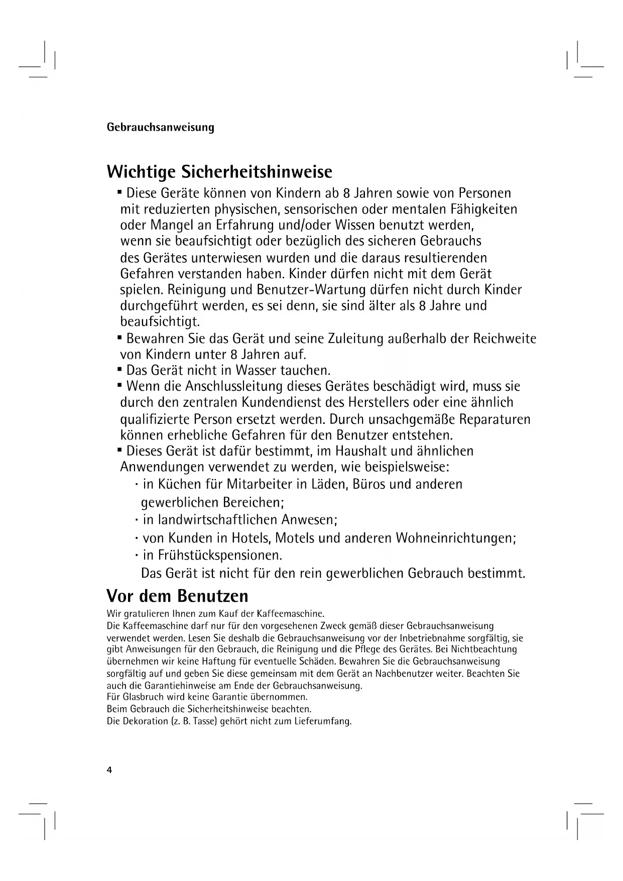 Die Kaffeemaschine darf nur für den vorgesehenen Zweck gemäß dieser Gebrauchsanweisung