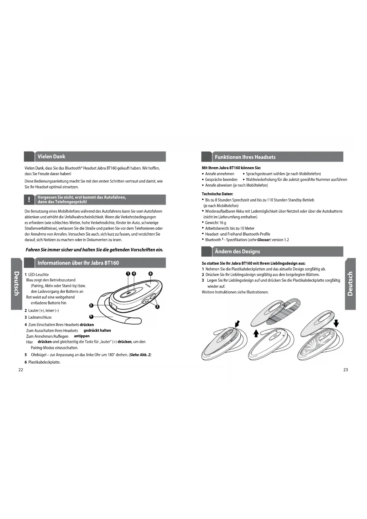 entladene Batterie hin2 Lauter (+), leiser (–)3 Ladeanschluss4 Zum Einschalten Ihres Headsets drücken Zum Ausschalten Ihres Headsets gedrückt halten Zum Annehmen/Auflegen antippen Hier drücken und gleichzeitig die Taste für „lauter“ (+) drücken, um den Pairing-Modus einzuschalten. 5 Ohrbügel – zur Anpassung an das linke Ohr um 180° drehen. (Siehe Abb. 2) 6 Plastikabdeckplatte.Mit Ihrem Jabra BT160 können Sie: • Anrufe annehmen • Sprachgesteuert wählen (je nach Mobiltelefon) • Gespräche beenden • Wahlwiederholung für die zuletzt gewählte Nummer ausführen • Anrufe abweisen (je nach Mobiltelefon)Technische Daten: • Bis zu 8 Stunden Sprechzeit und bis zu 110 Stunden Standby-Betrieb (je nach Mobiltelefon) • Wiederaufladbarer Akku mit Lademöglichkeit über Netzteil oder über die Autobatterie (nicht im Lieferumfang enthalten) • Gewicht 16 g • Arbeitsbereich: bis zu 10 Meter • Headset- und Freihand-Bluetooth-Profile • Bluetooth 1 - Spezifikation (siehe Glossar) version 1.2 Funktionen Ihres Headsets