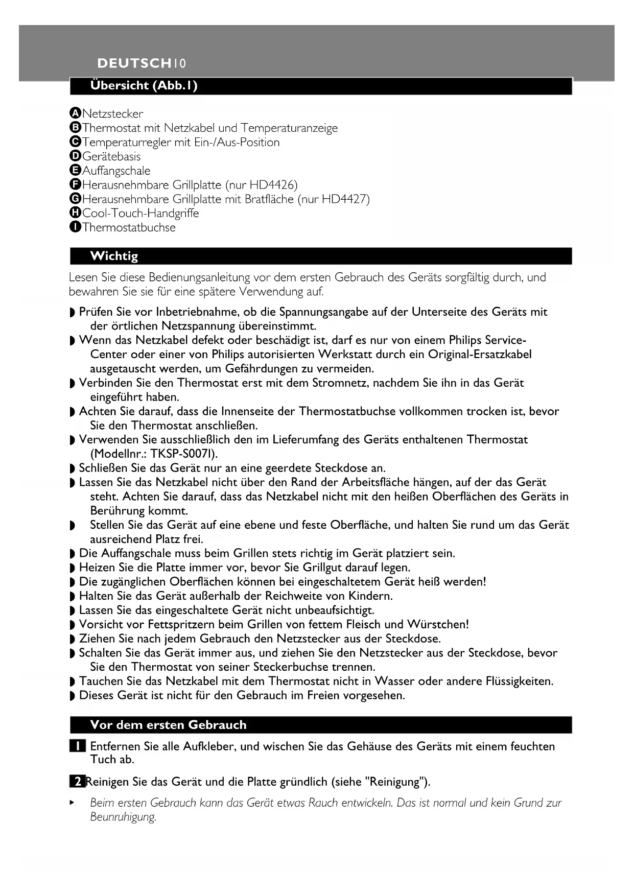 Laden Sie die Anleitung für Ihr Grill kostenlos im PDF-Format! Finden Sie Ihr Handbuch HD4426 - PHILIPS und nehmen Sie Ihr elektronisches Gerät wieder in die Hand. Auf dieser Seite sind alle Dokumente veröffentlicht, die für die Verwendung Ihres Geräts notwendig sind. HD4426 von der Marke PHILIPS.