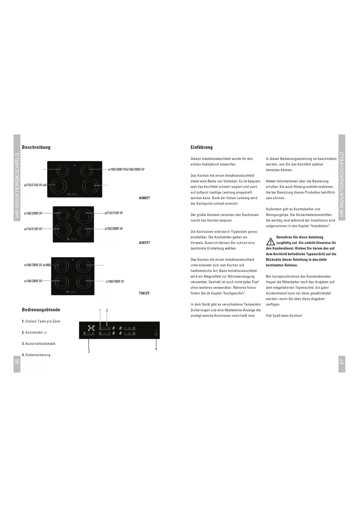 INSTRUCTIONS D'INSTALLATIONEinführung Dieses Induktionskochfeld wurde für den echten Hobbykoch entworfen. Das Kochen mit einem Induktionskochfeld bietet eine Reihe von Vorteilen: Es ist bequem, weil das Kochfeld schnell reagiert und auch auf äußerst niedrige Leistung eingestellt werden kann. Dank der hohen Leistung wird der Kochpunkt schnell erreicht. Der große Abstand zwischen den Kochzonen macht das Kochen bequem. Die Kochzonen sind durch Tipptasten genau einstellbar. Die Kochstufen gelten als Verweis. Dadurch können Sie schnell eine bestimmte Einstellung wählen. Das Kochen mit einem Induktionskochfeld unterscheidet sich vom Kochen auf herkömmliche Art. Beim Induktionskochfeld wird ein Magnetfeld zur Wärmeerzeugung verwendet. Deshalb ist auch nicht jeder Topf ohne weiteres verwendbar. Näheres hierzu finden Sie im Kapitel "Kochgeschirr". In dem Gerät gibt es verschiedene Temperatur Sicherungen und eine Restwärme-Anzeige die anzeigt welche Kochzonen noch heiß sind. In dieser Bedienungsanleitung ist beschrieben worden, wie Sie das Kochfeld optimal benutzen können. Neben Informationen über die Bedienung erhalten Sie auch Hintergrundinformationen, die bei Benutzung dieses Produktes behilflich sein können. Außerdem gibt es Kochtabellen und Reinigungstips. Die Sicherheitsvorschriften die wichtig sind während der Installation sind aufgenommen in das Kapitel “Installation”. Bewahren Sie diese Anleitung sorgfältig auf. Sie enthält Hinweise für den Kundendienst. Kleben Sie darum das auf dem Kochfeld befindliche Typenschild auf die Rückseite dieser Anleitung in den dafür bestimmten Rahmen. Bei Inanspruchnahme des Kundendienstes fragen die Mitarbeiter nach den Angaben auf dem mitgelieferten Typenschild. Ein guter Kundendienst kann nur dann gewährleistet werden, wenn Sie über diese Angaben verfügen. Viel Spaß beim Kochen! IHR INDUKTIONSKOCHFELD