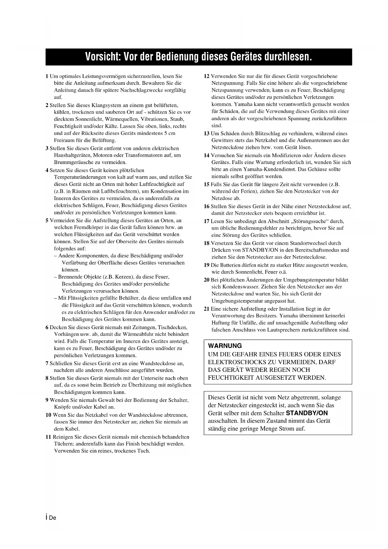 http://www.yamaha-uk.com/ pour les résidents au Royaume-Uni.) 5. Lorsque la garantie diffère entre le pays d’achat et le pays d’utilisation du produit, la garantie du pays d’utilisation est applicable. 6. Yamaha ne saurait être tenu pour responsable de quelconques pertes ou dommages, directs, consécutifs ou autres, sa responsabilité au titre de la garantie étant strictement limitée à la réparation ou au remplacement du produit. 7. Nous vous invitons à sauvegarder toutes les données ou réglages personnalisés de votre produit, Yamaha ne pouvant être tenu responsable de leur modification ou perte. 8. La présente garantie laisse intégralement subsister les droits que le consommateur peut détenir au titre de la garantie légale en vigueur ou au titre du contrat de vente conclu avec son revendeur. Information concernant la Collecte et le Traitement des piles Usagées et des déchets d’équipements électriques et électroniques Les symboles sur les produits, l’emballage et/ou les documents joints signifient que les produits électriques ou électroniques usagés ainsi que les piles ne doivent pas être mélangés avec les déchets domestiques habituels. Pour un traitement, une récupération et un recyclage appropriés des déchets d’équipements électriques et électroniques et des piles usagées, veuillez les déposer aux points de collecte prévus à cet effet, conformément à la réglementation nationale et aux Directives 2002/96/EC et 2006/66/EC. En vous débarrassant correctement des déchets d’équipements électriques et électroniques et des piles usagées, vous contribuerez à la sauvegarde de précieuses ressources et à la prévention de potentiels effets négatifs sur la santé humaine qui pourraient advenir lors d’un traitement inapproprié des déchets. Pour plus d’informations à propos de la collecte et du recyclage des déchets d’équipements électriques et électroniques et des piles usagées, veuillez contacter votre municipalité, votre service de traitement des déchets ou le point de vente où vous avez acheté les produits. [Information sur le traitement dans d’autres pays en dehors de l’Union Européenne] Ces symboles sont seulement valables dans l’Union Européenne. Si vous souhaitez vous débarrasser de déchets d’équipements électriques et électroniques ou de piles usagées, veuillez contacter les autorités locales ou votre fournisseur et demander la méthode de traitement appropriée. Note pour le symbole « pile » (deux exemples de symbole ci-dessous): Ce symbole peut être utilisé en combinaison avec un symbole chimique. Dans ce cas il respecte les exigences établies par la Directive pour le produit chimique en question.i De 1 Um optimales Leistungsvermögen sicherzustellen, lesen Sie bitte die Anleitung aufmerksam durch. Bewahren Sie die Anleitung danach für spätere Nachschlagzwecke sorgfältig auf. 2 Stellen Sie dieses Klangsystem an einem gut belüfteten, kühlen, trockenen und sauberen Ort auf - schützen Sie es vor direktem Sonnenlicht, Wärmequellen, Vibrationen, Staub, Feuchtigkeit und/oder Kälte. Lassen Sie oben, links, rechts und auf der Rückseite dieses Geräts mindestens 5 cm Freiraum für die Belüftung. 3 Stellen Sie dieses Gerät entfernt von anderen elektrischen Haushaltgeräten, Motoren oder Transformatoren auf, um Brummgeräusche zu vermeiden. 4 Setzen Sie dieses Gerät keinen plötzlichen Temperaturänderungen von kalt auf warm aus, und stellen Sie dieses Gerät nicht an Orten mit hoher Luftfeuchtigkeit auf (z.B. in Räumen mit Luftbefeuchtern), um Kondensation im Inneren des Gerätes zu vermeiden, da es anderenfalls zu elektrischen Schlägen, Feuer, Beschädigung dieses Gerätes und/oder zu persönlichen Verletzungen kommen kann. 5 Vermeiden Sie die Aufstellung dieses Gerätes an Orten, an welchen Fremdkörper in das Gerät fallen können bzw. an welchen Flüssigkeiten auf das Gerät verschüttet werden können. Stellen Sie auf der Oberseite des Gerätes niemals folgendes auf: – Andere Komponenten, da diese Beschädigung und/oder Verfärbung der Oberfläche dieses Gerätes verursachen können. – Brennende Objekte (z.B. Kerzen), da diese Feuer, Beschädigung des Gerätes und/oder persönliche Verletzungen verursachen können. – Mit Flüssigkeiten gefüllte Behälter, da diese umfallen und die Flüssigkeit auf das Gerät verschütten können, wodurch es zu elektrischen Schlägen für den Anwender und/oder zu Beschädigung des Gerätes kommen kann. 6 Decken Sie dieses Gerät niemals mit Zeitungen, Tischdecken, Vorhängen usw. ab, damit die Wärmeabfuhr nicht behindert wird. Falls die Temperatur im Inneren des Gerätes ansteigt, kann es zu Feuer, Beschädigung des Gerätes und/oder zu persönlichen Verletzungen kommen. 7 Schließen Sie dieses Gerät erst an eine Wandsteckdose an, nachdem alle anderen Anschlüsse ausgeführt wurden. 8 Stellen Sie dieses Gerät niemals mit der Unterseite nach oben auf, da es sonst beim Betrieb zu Überhitzung mit möglichen Beschädigungen kommen kann. 9 Wenden Sie niemals Gewalt bei der Bedienung der Schalter, Knöpfe und/oder Kabel an. 10 Wenn Sie das Netzkabel von der Wandsteckdose abtrennen, fassen Sie immer den Netzstecker an; ziehen Sie niemals an dem Kabel. 11 Reinigen Sie dieses Gerät niemals mit chemisch behandelten Tüchern; anderenfalls kann das Finish beschädigt werden. Verwenden Sie ein reines, trockenes Tuch. 12 Verwenden Sie nur die für dieses Gerät vorgeschriebene Netzspannung. Falls Sie eine höhere als die vorgeschriebene Netzspannung verwenden, kann es zu Feuer, Beschädigung dieses Gerätes und/oder zu persönlichen Verletzungen kommen. Yamaha kann nicht verantwortlich gemacht werden für Schäden, die auf die Verwendung dieses Gerätes mit einer anderen als der vorgeschriebenen Spannung zurückzuführen sind. 13 Um Schäden durch Blitzschlag zu verhindern, während eines Gewitters stets das Netzkabel und die Außenantennen aus d