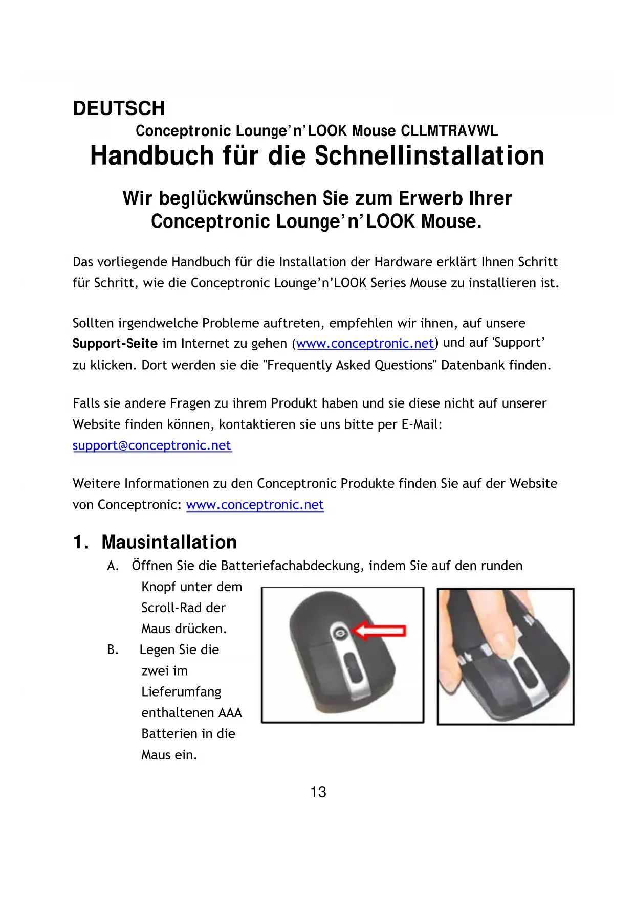 Das vorliegende Handbuch für die Installation der Hardware erklärt Ihnen Schritt für Schritt, wie die Conceptronic Lounge'n'LOOK Series Mouse zu installmenten ist.