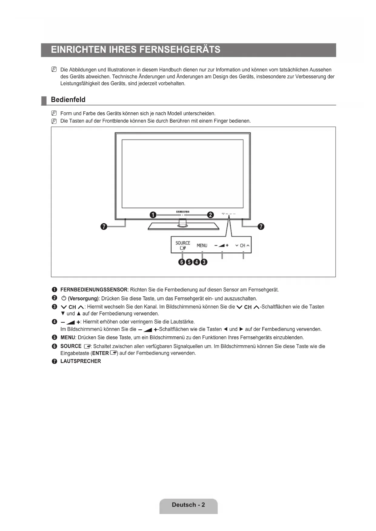 + Anschließen von Anynet + -Geräten 38Einrichten von Anynet+ 39Wechseln zwischen von Anynet + -Geräten 40Aufnahme 41Wiedergabe über einen Receiver (Heimkinosystem) 41Fehlerbehebung für Anynet + 42 EMPFEHLUNGEN Videotextfunktion 43Anbringen des Standfußes 44Lösen des Standfußes 45Anbringen der Wandhalterung 45Kensington-Schloss als Diebstahlsicherung 45Verlegen der Kabel 46Vorbereiten für den Einbau der Wandhalterung 46Absichern des Einbaubereichs 47Befestigen des Fernsehgeräts an der Wand 47Fehlerbehebung: Vor der Kontaktaufnahme mit dem Kundendienst .... 48Technische Daten 49 ■