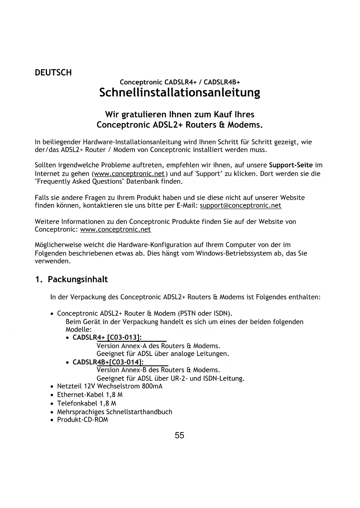Conceptronic CADSLR4+ / CADSLR4B+ Schnellinstallationsanleitung Wir gratulieren Ihnen zum Kauf Ihres Conceptronic ADSL2+ Routers & Modems. In beiliegender Hardware-Installationsanleitung wird Ihnen Schritt für Schritt gezeigt, wie der/das ADSL2+ Router / Modem von Conceptronic installiert werden muss. Sollten irgendwelche Probleme auftreten, empfehlen wir ihnen, auf unsere Support-Seite im Internet zu gehen (www.conceptronic.net ) und auf 'Support’ zu klicken. Dort werden sie die "Frequently Asked Questions" Datenbank finden. Falls sie andere Fragen zu ihrem Produkt haben und sie diese nicht auf unserer Website finden können, kontaktieren sie uns bitte per E-Mail: support@conceptronic.net