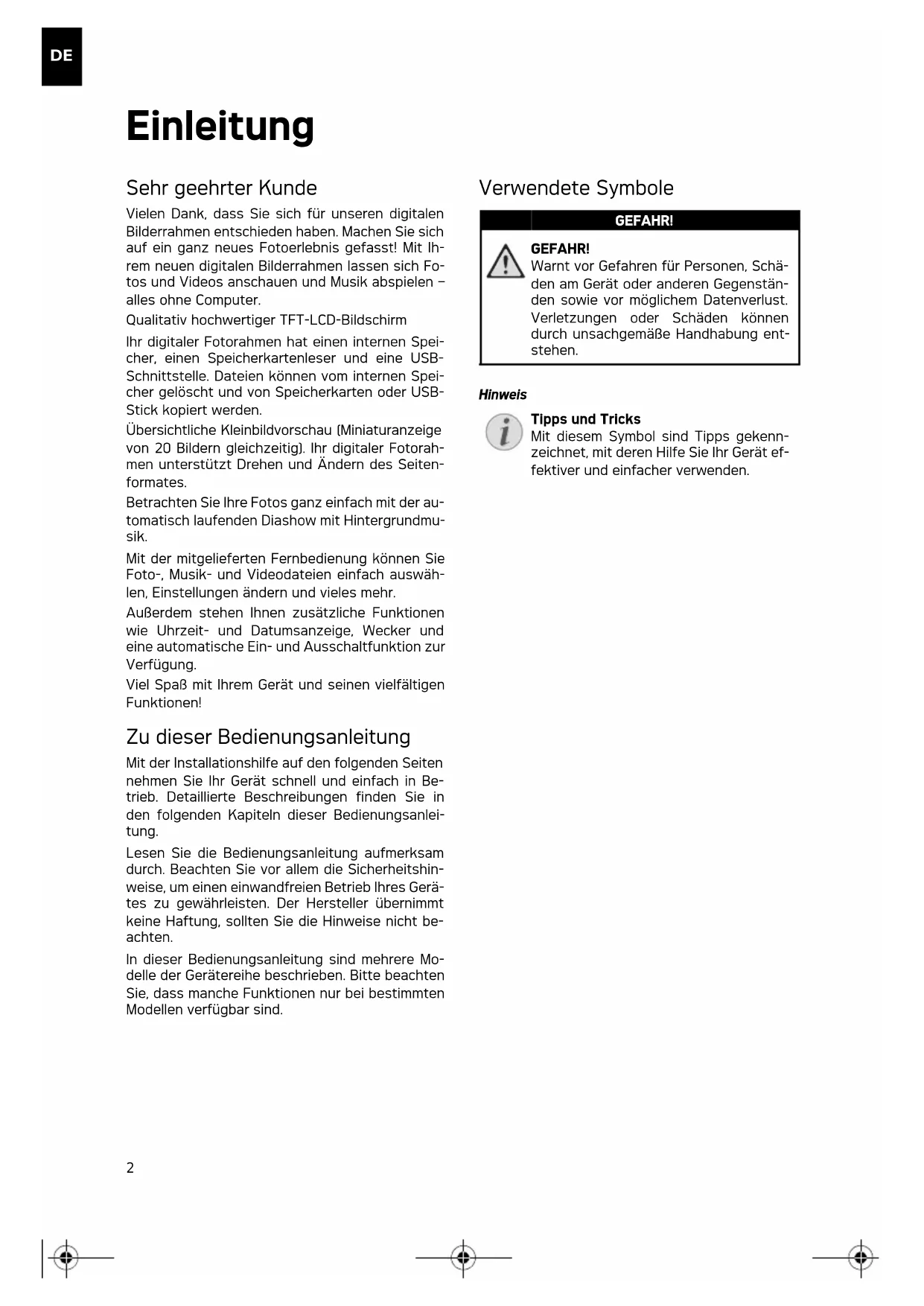 Einleitung Sehr geehrter Kunde Vielen Dank, dass Sie sich für unseren digitalen Bilderrahmen entschieden haben. Machen Sie sich auf ein ganz neues Fotoerlebnis gefasst! Mit Ih- rem neuen digitalen Bilderrahmen lassen sich Fo- tos und Videos anschauen und Musik abspielen – alles ohne Computer. Qualitativ hochwertiger TFT-LCD-Bildschirm Speicher Ihr digitaler Fotorahmen hat einen internen Spei- cher, einen Speicherkartenleser und eine USB- Schnittstelle. Dateien können vom internen Spei- cher gelöscht und von Speicherkarten oder USB- Stick kopiert werden. Übersichtliche Kleinbildvorschau (Miniaturanzeige von 20 Bildern gleichzeitig). Ihr digitaler Fotorah- men unterstützt Drehen und Ändern des Seiten- formates. Betrachten Sie Ihre Fotos ganz einfach mit der au- tomatisch laufenden Diashow mit Hintergrundmu- sik. Mit der mitgelieferten Fernbedienung können Sie Foto-, Musik- und Videodateien einfach auswäh- len, Einstellungen ändern und vieles mehr. Außerdem stehen Ihnen zusätzliche Funktionen wie Uhrzeit- und Datumsanzeige, Wecker und eine automatische Ein- und Ausschaltfunktion zur Verfügung. Viel Spaß mit Ihrem Gerät und seinen vielfältigen Funktionen! Zu dieser Bedienungsanleitung Mit der Installationshilfe auf den folgenden Seiten nehmen Sie Ihr Gerät schnell und einfach in Be- trieb. Detaillierte Beschreibungen finden Sie in den folgenden Kapiteln dieser Bedienungsanlei- tung. Lesen Sie die Bedienungsanleitung aufmerksam durch. Beachten Sie vor allem die Sicherheitshin- weise, um einen einwandfreien Betrieb Ihres Gerä- tes zu gewährleisten. Der Hersteller übernimmt keine Haftung, sollten Sie die Hinweise nicht be- achten. In dieser Bedienungsanleitung sind mehrere Mo- delle der Gerätereihe beschrieben. Bitte beachten Sie, dass manche Funktionen nur bei bestimmten Modellen verfügbar sind. Verwendete Symbole Gefahrenwarnung Tipps und Tricks GEFAHR! GEFAHR! Warnt vor Gefahren für Personen, Schä- den am Gerät oder anderen Gegenstän- den sowie vor möglichem Datenverlust. Verletzungen oder Schäden können durch unsachgemäße Handhabung ent- stehen. Hinweis Tipps und Tricks Mit diesem Symbol sind Tipps gekenn- zeichnet, mit deren Hilfe Sie Ihr Gerät ef- fektiver und einfacher verwenden. af-5077_5087_5107psms_manual_01_de_253243477-a.book Seite 2 Donnerstag, 2. Juli 2009 11:37 113
