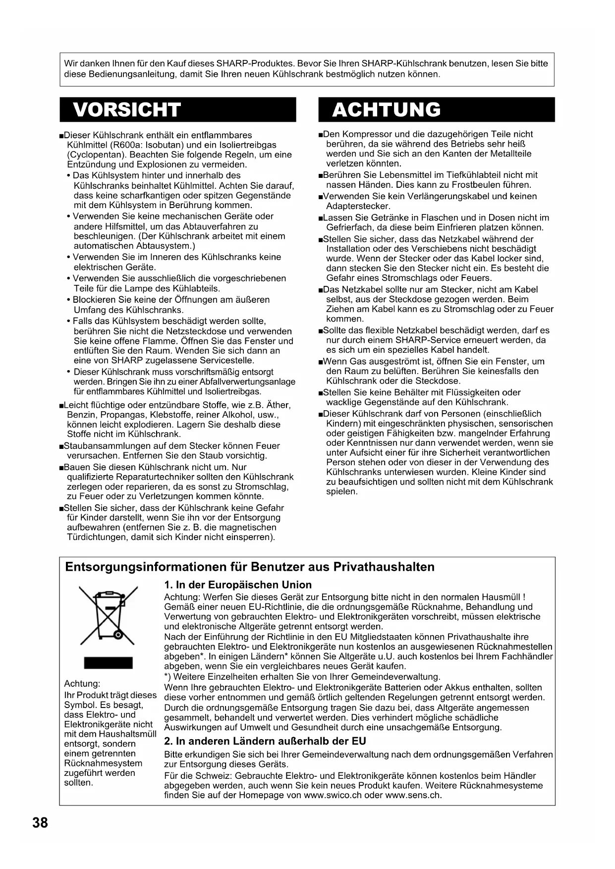 Wir danken Ihnen für den Kauf dieses SHARP-Produktes. Bevor Sie Ihren SHARP-Kühlschrank benutzen, lesen Sie bitte