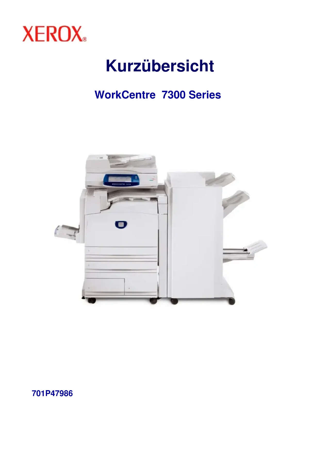 chiude completamente, accertarsi che la cartuccia sia bloccata in sede. La procedura di sostituzione della cartuccia toner è completata. WorkCentre 7300 Series WorkCentre 7300 Series Guida rapidaKurzübersicht WorkCentre 7300 Series 701P47986Hinweis: BLAUE Überschriften dienen zur Kennzeichnung von Abschnitten für IT- Administratoren, mit GRÜNEN Überschriften werden Abschnitte für Endanwender hervorgehoben und durch ROTE Überschriften wird auf erforderliche Benutzereingriffe hingewiesen. Die Bildschirmfunktionen werden je nach Konfiguration unterschiedlich angezeigt. Microsoft, MS-DOS, Windows, Windows NT, Microsoft Network und Windows Server sind Marken der Microsoft Corporation in den USA und/oder anderen Ländern. Novell, NetWare, IntranetWare und NDS sind Marken von Novell, Inc. in den USA und anderen Ländern. Adobe, Acrobat, PostScript, PostScript3 und PostScript Logo sind Marken von Adobe Systems Incorporated. Apple, AppleTalk, EtherTalk, LocalTalk, Macintosh, MacOS und TrueType sind Marken von Apple Computer, Inc. in den USA und anderen Ländern. HP, HPGL, HPGL/2 und HP-U X sind Marken der Hewlett-Packard Corporation. Alle Produktnamen sind Marken der jeweiligen Eigentümer. Bei Problemen mit der Festplatte des Geräts können die darauf gespeicherten Daten verloren gehen. Xerox übernimmt keine Verantwortung für direkte oder indirekte Schäden aus solchen Datenverlusten.Xerox übernimmt keine Verantwortung für Geräteausfälle aufgrund von Computerviren oder Hacking. Wichtig(1): Dieses Handbuch ist urheberrechtlich geschützt. Alle Rechte vorbehalten. Gemäß dem Urheberrechtsgesetz darf dieses Handbuch ohne schriftliche Genehmigung des Verlegers weder ganz noch teilweise kopiert werden.(2) Teile dieses Handbuchs können ohne Vorankündigung geändert werden.(3) Wir begrüßen jede Anmerkung zu Zweideutigkeiten, Fehlern, Auslassungen oder fehlenden Seiten.(4) Niemals Arbeiten am Gerät durchführen, die nicht ausführlich in diesem Handbuch beschrieben sind. Unbefugter Betrieb kann zu Störungen oder Unfällen führen. Xerox übernimmt keine Haftung für Probleme, die aus dem unbefugten Betrieb des Geräts hervorgehen. Der Export dieses Produkts unterliegt einer strengen Kontrolle in Übereinstimmung mit den japanischen Devisen- und Außenhandelsgesetzen und den Restriktionsbestimmungen der USA. Xerox und Ethernet sind Marken.WorkCentre 7300 Series WorkCentre 7300 Series Kurzübersicht Inhaltsverzeichnis Steuerpult Scanausgabe: Startseite