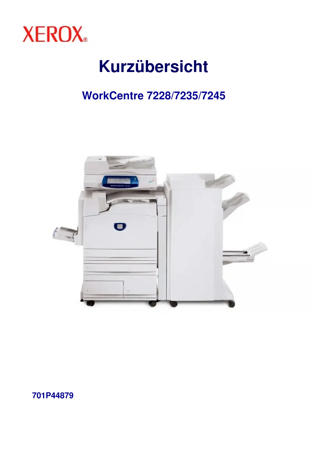 chiude completamente, accertarsi che la cartuccia sia bloccata in sede. La procedura di sostituzione della cartuccia toner è completata.Kurzübersicht WorkCentre 7228/7235/7245 701P44879Hinweis: BLAUE Überschriften dienen zur Kennzeichnung von Abschnitten für IT- Administratoren, mit GRÜNEN Überschriften werden Abschnitte für Endanwender hervorgehoben und durch ROTE Überschriften wird auf erforderliche Benutzereingriffe hingewiesen. Das Aussehen der schnittstelle kann je nach Gerätekonfiguration und Geräteeinstellungen variieren. Microsoft, MS-DOS, Windows, Windows NT, Microsoft Network und Windows Server sind Marken der Microsoft Corporation in den Vereinigten Staaten und anderen Ländern. Novell, NetWare, IntranetWare und NDS sind Marken von Novell, Inc. in den Vereinigten Staaten und anderen Ländern. Adobe, Acrobat, PostScript, PostScript3 und PostScript Logo sind Marken von Adobe Systems Incorporated. Apple, AppleTalk, EtherTalk, LocalTalk, Macintosh, MacOS und TrueType sind Marken von Apple Computer, Inc., eingetragen in den Vereinigten Staaten und anderen Ländern. HP, HPGL, HPGL/2 und HP-U X sind Marken der Hewlett-Packard Corporation. Alle Produktnamen sind Marken der jeweiligen Eigentümer. Die auf der Festplatte des Systems gespeicherten Daten können bei Festplattenproblemen verloren gehen. Xerox übernimmt keine Verantwortung für direkte oder indirekte Schäden, die aus einem derartigen Datenverlust entstehen. Xerox trägt keine Verantwortung für Ausfälle des Systems, die auf eine Infektion mit Computerviren oder Aktivitäten von Hackern zurückgehen. Wichtiger Hinweis: (1) Dieses Handbuch unterliegt dem Urheberrecht, alle Rechte vorbehalten. Laut Gesetz darf dieses Handbuch ohne schriftliche Genehmigung des Herausgebers weder komplett noch auszugsweise kopiert oder geändert werden. (2) Teile dieses Handbuch können ohne vorherige Ankündigung geändert werden. (3) Wir begrüßen Kommentare in Bezug auf missverständliche Formulierungen, Fehler, Auslassungen oder fehlende Seiten. (4) Die hier beschriebenen Vorgehensweisen dürfen nur an Systemen durchgeführt werden, auf die sich die vorliegende Beschreibung ausdrücklich bezieht . Durch unsachgemäßen Betrieb können Fehler oder Unfälle verursacht werden. Für Probleme, die sich aus der unsachgemäßen Handhabung des Geräts ergeben, trägt Xerox keine Haftung. Der Export dieses Produkts ist in Übereinstimmung mit den Gesetzen in Bezug auf den Export und Außenhandel Japans und/oder die Exportbestimmungen der Vereinigten Staaten streng geregelt. Xerox und Ethernet sind Marken.WorkCentre 7228/7235/7245 WorkCentre 7228/7235/7245 Kurzübersicht Inhaltsverzeichnis Steuerpult Konfigurationsbericht ausdrucken