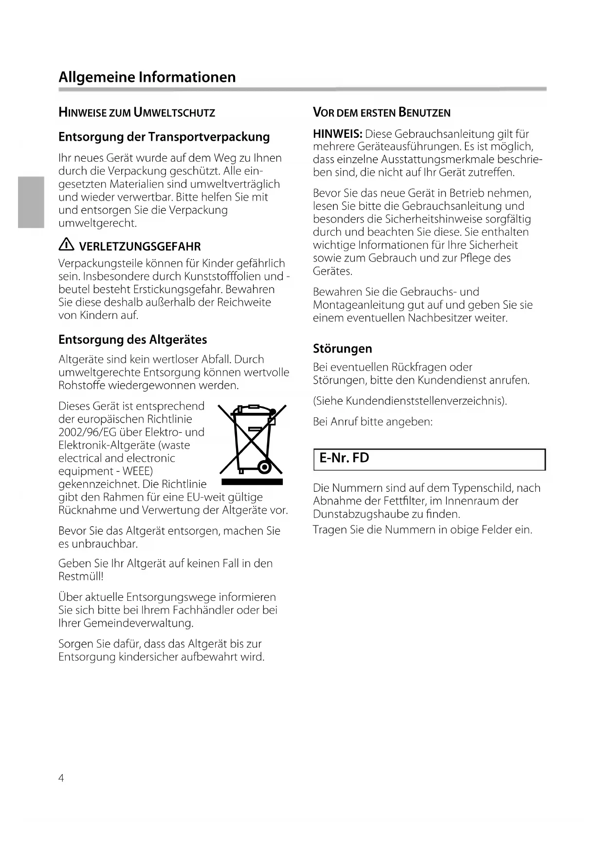 Entsorgung der Transportverpackung Ihr neues Gerät wurde auf dem Weg zu Ihnendurch die Verpackung geschützt. Alle ein-gesetzten Materialien sind umweltverträglichund wieder verwertbar. Bitte helfen Sie mitund entsorgen Sie die Verpackungumweltgerecht. VERLETZUNGSGEFAHR Verpackungsteile können für Kinder gefährlichsein. Insbesondere durch Kunststofolien und -beutel besteht Erstickungsgefahr. BewahrenSie diese deshalb außerhalb der Reichweitevon Kindern auf. Entsorgung des Altgerätes Altgeräte sind kein wertloser Abfall. Durchumweltgerechte Entsorgung können wertvolleRohstoe wiedergewonnen werden.Dieses Gerät ist entsprechendder europäischen Richtlinie2002/96/EG über Elektro- undElektronik-Altgeräte (wasteelectrical and electronicequipment - WEEE)gekennzeichnet. Die Richtliniegibt den Rahmen für eine EU-weit gültigeRücknahme und Verwertung der Altgeräte vor.Bevor Sie das Altgerät entsorgen, machen Siees unbrauchbar.Geben Sie Ihr Altgerät auf keinen Fall in denRestmüll!Über aktuelle Entsorgungswege informierenSie sich bitte bei Ihrem Fachhändler oder beiIhrer Gemeindeverwaltung.Sorgen Sie dafür, dass das Altgerät bis zurEntsorgung kindersicher aufbewahrt wird. Störungen Bei eventuellen Rückfragen oder Störungen, bitte den Kundendienst anrufen. (Siehe Kundendienststellenverzeichnis).Bei Anruf bitte angeben:Die Nummern sind auf dem Typenschild, nachAbnahme der Fettlter, im Innenraum derDunstabzugshaube zu nden.Tragen Sie die Nummern in obige Felder ein.