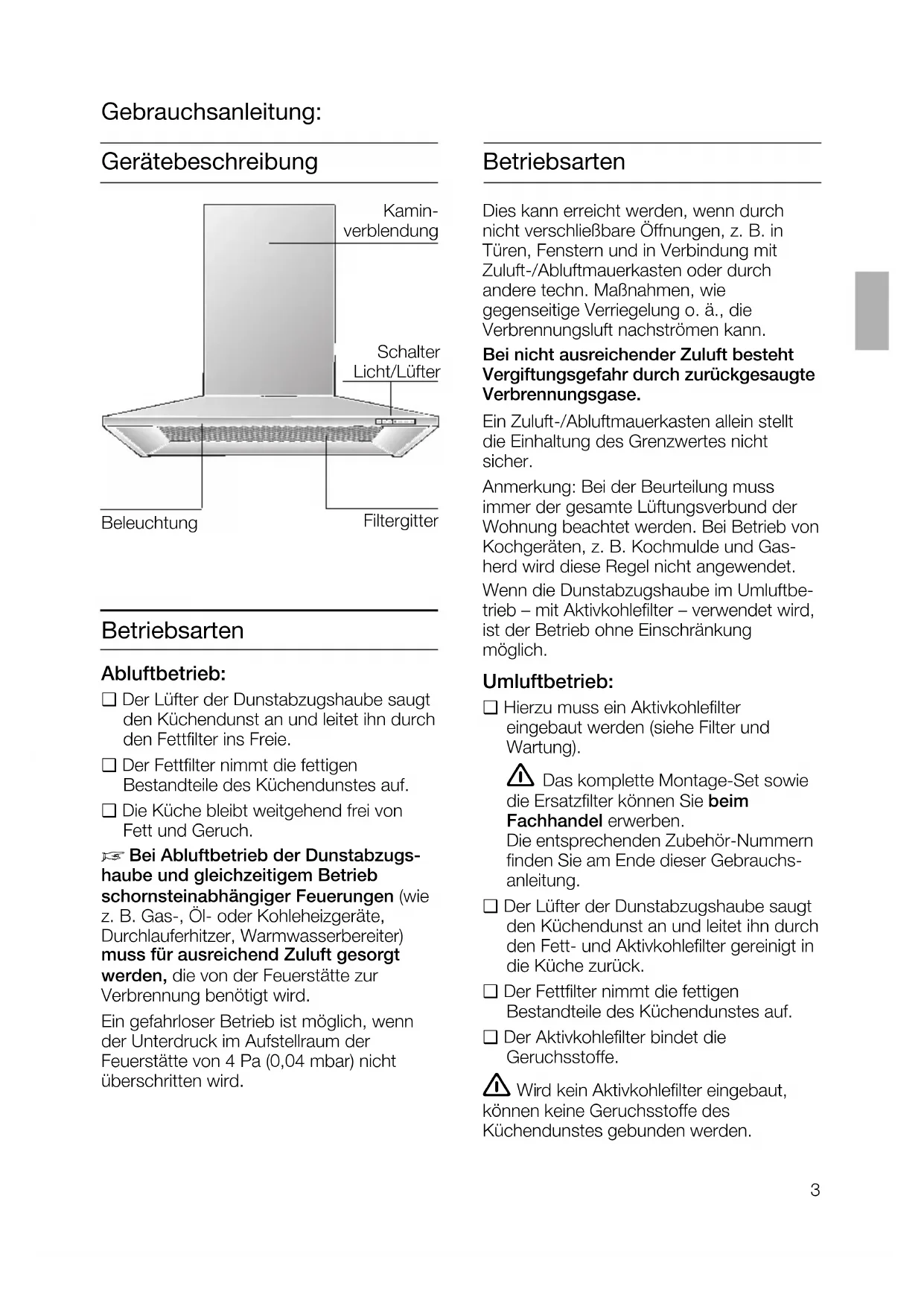 Bei Abluftbetrieb der Dunstabzugs- haube und gleichzeitigem Betrieb schornsteinabhängiger Feuerungen (wie z. B. Gas-, Öl- oder Kohleheizgeräte, Durchlauferhitzer, Warmwasserbereiter) muss für ausreichend Zuluft gesorgt werden, die von der Feuerstätte zur Verbrennung benötigt wird. Ein gefahrloser Betrieb ist möglich, wenn der Unterdruck im Aufstellraum der Feuerstätte von 4 Pa (0,04 mbar) nicht überschritten wird. Dies kann erreicht werden, wenn durch nicht verschließbare Öffnungen, z. B. in Türen, Fenstern und in Verbindung mit Zuluft-/Abluftmauerkasten oder durch andere techn. Maßnahmen, wie gegenseitige Verriegelung o. ä., die Verbrennungsluft nachströmen kann. Bei nicht ausreichender Zuluft besteht Vergiftungsgefahr durch zurückgesaugte Verbrennungsgase. Ein Zuluft-/Abluftmauerkasten allein stellt die Einhaltung des Grenzwertes nicht sicher. Anmerkung: Bei der Beurteilung muss immer der gesamte Lüftungsverbund der Wohnung beachtet werden. Bei Betrieb von Kochgeräten, z. B. Kochmulde und Gas- herd wird diese Regel nicht angewendet. Wenn die Dunstabzugshaube im Umluftbe- trieb – mit Aktivkohlefilter – verwendet wird, ist der Betrieb ohne Einschränkung möglich. Umluftbetrieb: ❑ Hierzu muss ein Aktivkohlefilter eingebaut werden (siehe Filter und Wartung). Das komplette Montage-Set sowie die Ersatzfilter können Sie beim Fachhandel erwerben. Die entsprechenden Zubehör-Nummern finden Sie am Ende dieser Gebrauchs- anleitung. ❑ Der Lüfter der Dunstabzugshaube saugt den Küchendunst an und leitet ihn durch den Fett- und Aktivkohlefilter gereinigt in die Küche zurück. ❑ Der Fettfilter nimmt die fettigen Bestandteile des Küchendunstes auf. ❑ Der Aktivkohlefilter bindet die Geruchsstoffe. Wird kein Aktivkohlefilter eingebaut, können keine Geruchsstoffe des Küchendunstes gebunden werden. Beleuchtung Schalter Licht/Lüfter Filtergitter Kamin- verblendung4 Vor dem ersten Benutzen Wichtige Hinweise: ❑ Diese Gebrauchsanleitung gilt für mehrere Geräte-Ausführungen. Es ist möglich, dass einzelne Ausstattungsmerkmale beschrieben sind, die nicht auf Ihr Gerät zutreffen. ❑ Diese Dunstabzugshaube entspricht den einschlägigen Sicherheitsbestimmungen. Reparaturen dürfen nur von Fachkräften durchgeführt werden. Durch unsachgemäße Reparaturen können erhebliche Gefahren für den Benutzer entstehen. Unter der Dunstabzugshaube nicht flambieren. Brandgefahr am Fettfilter durch ! aufsteigende Flammen. Die Kochstellen müssen immer mit Kochgeschirr abgedeckt sein. Über einer Feuerstätte für feste Brennstoffe (Kohle, Holz und dgl.) ist der Betrieb der Dunstabzugshaube nur bedingt gestattet (siehe Montageanleitung). Gas-Kochmulden / Gas-Herde Betreiben Sie nicht alle Gas- Kochstellen gleichzeitig über längere Zeit (max. 15 Minuten) bei höchster Wärmebelastung, sonst besteht Verbrennungsgefahr bei Berührung der Gehäuseoberflächen bzw. Gefahr der Beschädigung der Dunstabzugshaube. Beim Betrieb der Dunstabzugshaube über einem Gas-Kochfeld muss bei gleich- zeitigem Betreiben von drei oder mehr Gas-Kochstellen die Haube in der Maximalstufe betrieben werden. ❑ Bevor Sie das neue Gerät benutzen, lesen Sie bitte sorgfältig die Gebrauchsanleitung. Sie enthält wichtige Informationen für Ihre Sicherheit sowie zum Gebrauch und zur Pflege des Gerätes. ❑ Bewahren Sie die Gebrauchs- und Montageanleitung ggf. für einen Nachbesitzer gut auf. Ist das Gerät beschädigt, dürfen Sie es nicht in Betrieb nehmen. Anschluss und Inbetriebnahme dürfen nur von einem Fachmann durchgeführt werden. Wenn die Anschlussleitung dieses Gerätes beschädigt wird, muss sie durch den Hersteller oder seinen Kundendienst oder eine ähnlich qualifizierte Person ersetzt werden, um Gefährdung zu vermeiden. Verpackungsmaterial ordnungsgemäß entsorgen (siehe Montageanleitung). Diese Dunstabzugshaube ist nur für den Betrieb in Haushalten bestimmt. Dunstabzugshaube nur mit eingesetzten Lampen betreiben. Defekte Lampen sollten sofort ersetzt werden, um Überlastung der restlichen Lampen zu vermeiden. Dunstabzugshaube nie ohne Fettfilter betreiben. Überhitzte Fette oder Öle können sich leicht entzünden. Darum Speisen mit Fetten oder Ölen, z. B. Pommes frites, nur unter Aufsicht zubereiten.5 Bedienen der Dunstabzugshau