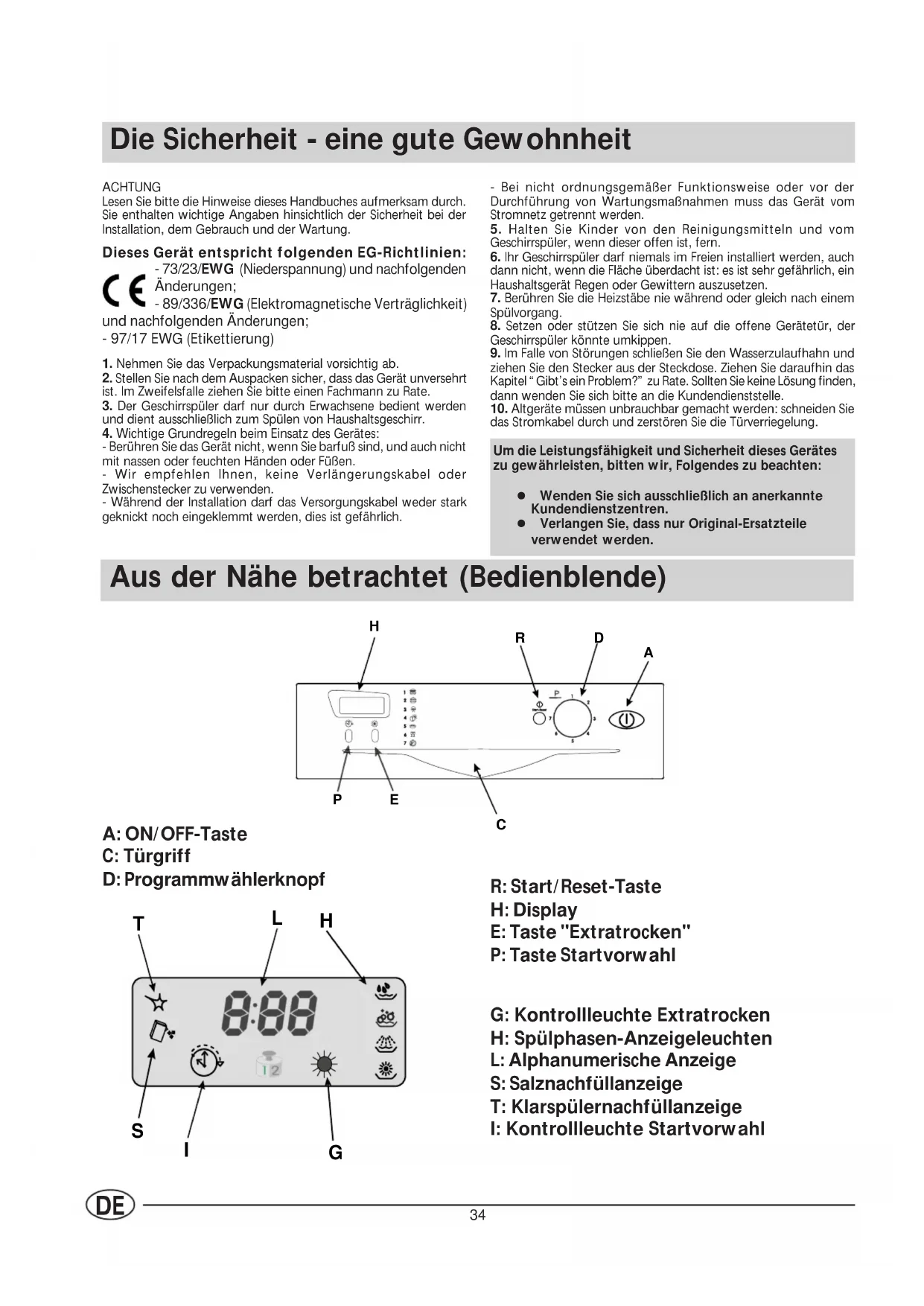 - 97/17 EWG (Etikettierung) 1. Nehmen Sie das Verpackungsmaterial vorsichtig ab.2. Stellen Sie nach dem Auspacken sicher, dass das Gerät unversehrtist. Im Zweifelsfalle ziehen Sie bitte einen Fachmann zu Rate.3. Der Geschirrspüler darf nur durch Erwachsene bedient werdenund dient ausschließlich zum Spülen von Haushaltsgeschirr.4. Wichtige Grundregeln beim Einsatz des Gerätes:- Berühren Sie das Gerät nicht, wenn Sie barfuß sind, und auch nichtmit nassen oder feuchten Händen oder Füßen.- Wir empfehlen Ihnen, keine Verlängerungskabel oderZwischenstecker zu verwenden.- Während der Installation darf das Versorgungskabel weder starkgeknickt noch eingeklemmt werden, dies ist gefährlich. Aus der Nähe betrachtet (Bedienblende) - Bei nicht ordnungsgemäßer Funktionsweise oder vor derDurchführung von Wartungsmaßnahmen muss das Gerät vomStromnetz getrennt werden.5. Halten Sie Kinder von den Reinigungsmitteln und vomGeschirrspüler, wenn dieser offen ist, fern.6. Ihr Geschirrspüler darf niemals im Freien installiert werden, auchdann nicht, wenn die Fläche überdacht ist: es ist sehr gefährlich, einHaushaltsgerät Regen oder Gewittern auszusetzen.7. Berühren Sie die Heizstäbe nie während oder gleich nach einemSpülvorgang.8. Setzen oder stützen Sie sich nie auf die offene Gerätetür, derGeschirrspüler könnte umkippen.9. Im Falle von Störungen schließen Sie den Wasserzulaufhahn undziehen Sie den Stecker aus der Steckdose. Ziehen Sie daraufhin dasKapitel “Gibt’s ein Problem?” zu Rate. Sollten Sie keine Lösung finden,dann wenden Sie sich bitte an die Kundendienststelle.10. Altgeräte müssen unbrauchbar gemacht werden: schneiden Siedas Stromkabel durch und zerstören Sie die Türverriegelung.Um die Leistungsfähigkeit und Sicherheit dieses Geräteszu gewährleisten, bitten wir, Folgendes zu beachten:l Wenden Sie sich ausschließlich an anerkannteKundendienstzentren.l Verlangen Sie, dass nur Original-Ersatzteileverwendet werden. A: ON/OFF-Taste
