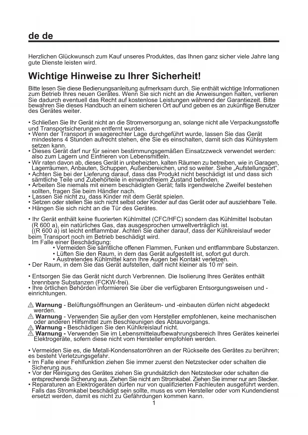 • Ihr Gerät enthält keine fluorierten Kühlmittel (CFC/HFC) sondern das Kühlmittel Isobutan