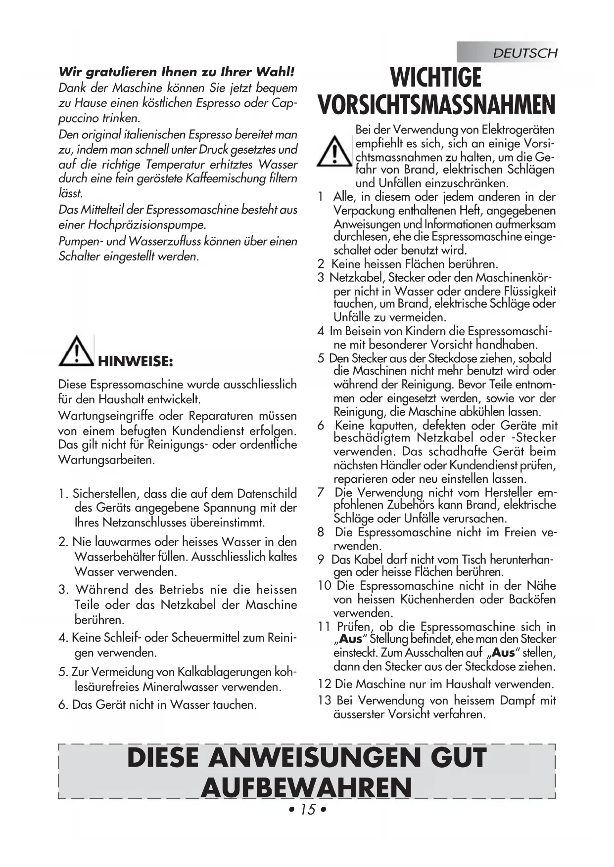 DIESE ANWEISUNGEN GUT AUFBEWAHREN WICHTIGE VORSICHTSMASSNAHMENDEUTSCH