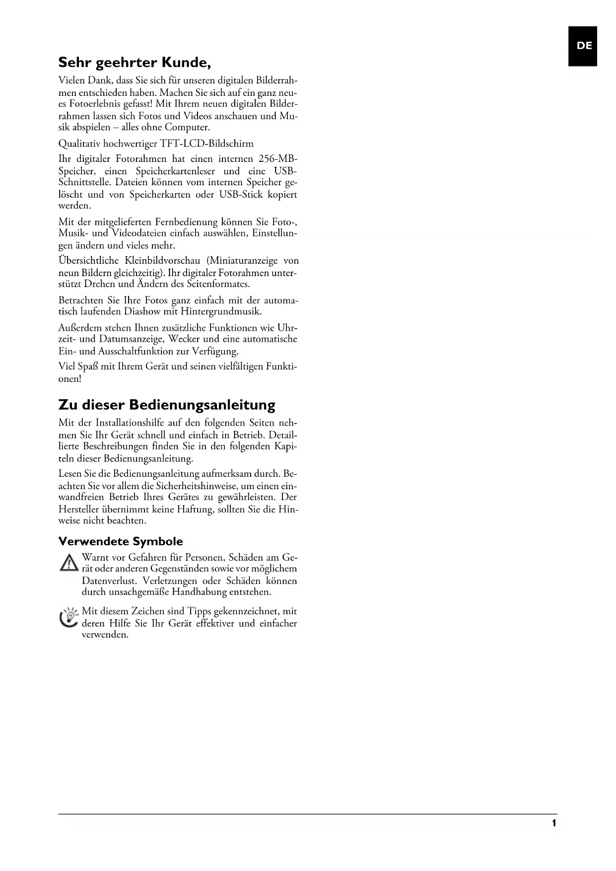 Sehr geehrter Kunde, Vielen Dank, dass Sie sich für unseren digitalen Bilderrah- men entschieden haben. Machen Sie sich auf ein ganz neu- es Fotoerlebnis gefasst! Mit Ihrem neuen digitalen Bilder- rahmen lassen sich Fotos und Videos anschauen und Mu- sik abspielen – alles ohne Computer. Qualitativ hochwertiger TFT-LCD-Bildschirm Speicher Ihr digitaler Fotorahmen hat einen internen 256-MB- Speicher, einen Speicherkartenleser und eine USB- Schnittstelle. Dateien können vom internen Speicher ge- löscht und von Speicherkarten oder USB-Stick kopiert werden. Mit der mitgelieferten Fernbedienung können Sie Foto-, Musik- und Videodateien einfach auswählen, Einstellun- gen ändern und vieles mehr. Übersichtliche Kleinbildvorschau (Miniaturanzeige von neun Bildern gleichzeitig). Ihr digitaler Fotorahmen unter- stützt Drehen und Ändern des Seitenformates. Betrachten Sie Ihre Fotos ganz einfach mit der automa- tisch laufenden Diashow mit Hintergrundmusik. Außerdem stehen Ihnen zusätzliche Funktionen wie Uhr- zeit- und Datumsanzeige, Wecker und eine automatische Ein- und Ausschaltfunktion zur Verfügung. Viel Spaß mit Ihrem Gerät und seinen vielfältigen Funkti- onen! Zu dieser Bedienungsanleitung Mit der Installationshilfe auf den folgenden Seiten neh- men Sie Ihr Gerät schnell und einfach in Betrieb. Detail- lierte Beschreibungen finden Sie in den folgenden Kapi- teln dieser Bedienungsanleitung. Lesen Sie die Bedienungsanleitung aufmerksam durch. Be- achten Sie vor allem die Sicherheitshinweise, um einen ein- wandfreien Betrieb Ihres Gerätes zu gewährleisten. Der Hersteller übernimmt keine Haftung, sollten Sie die Hin- weise nicht beachten. Verwendete Symbole GefahrenwarnungHinweis-Erklärung Warnt vor Gefahren für Personen, Schäden am Ge- rät oder anderen Gegenständen sowie vor möglichem Datenverlust. Verletzungen oder Schäden können durch unsachgemäße Handhabung entstehen. Mit diesem Zeichen sind Tipps gekennzeichnet, mit deren Hilfe Sie Ihr Gerät effektiver und einfacher verwenden. af-5105_5086_5135ms_manual_de_253145895-a.book Seite 1 Montag, 15. September 2008 9:56 092 AgfaPhoto Digital Photo Frame AF 5086MS · AF 5105MS · AF5135MS