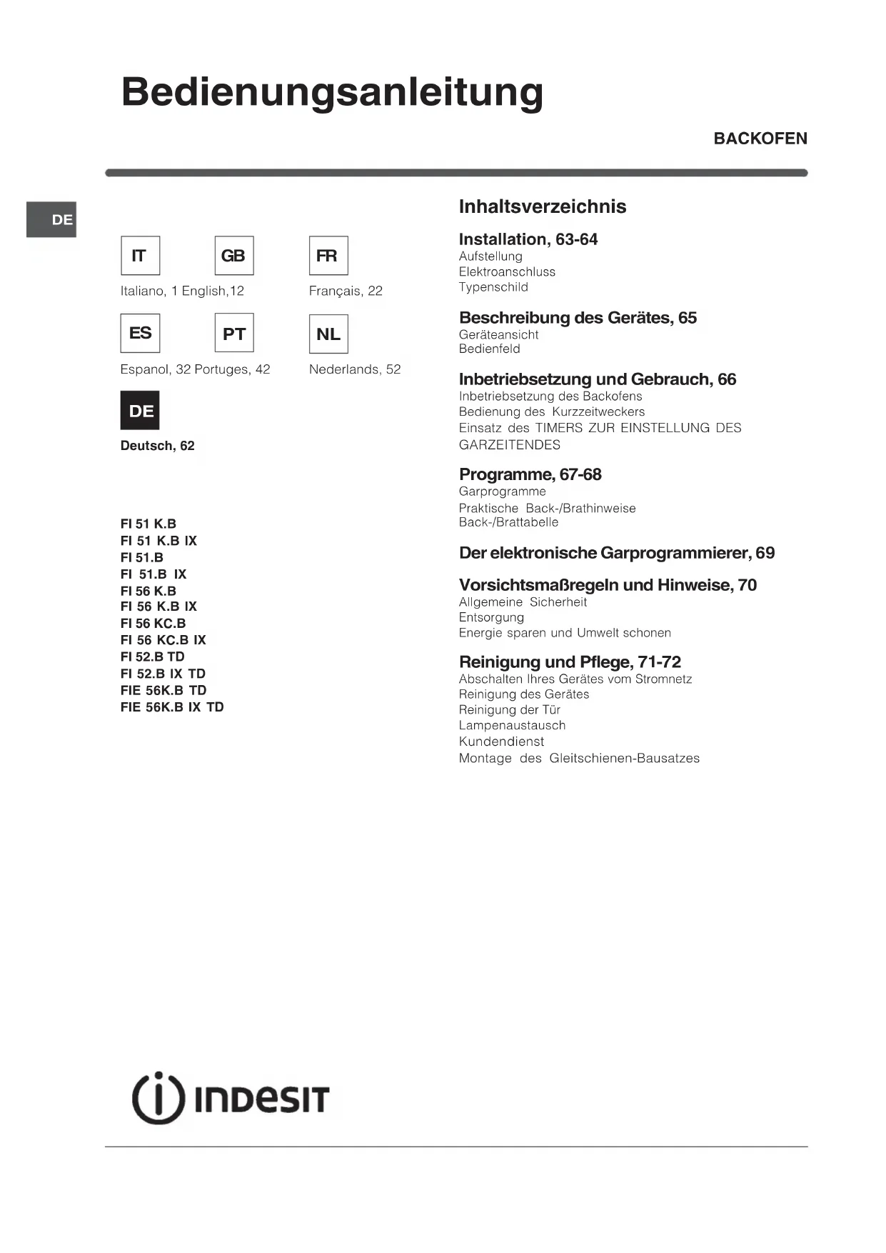 Laden Sie die Anleitung für Ihr Ofen kostenlos im PDF-Format! Finden Sie Ihr Handbuch FIE 56 KB BK - INDESIT und nehmen Sie Ihr elektronisches Gerät wieder in die Hand. Auf dieser Seite sind alle Dokumente veröffentlicht, die für die Verwendung Ihres Geräts notwendig sind. FIE 56 KB BK von der Marke INDESIT.