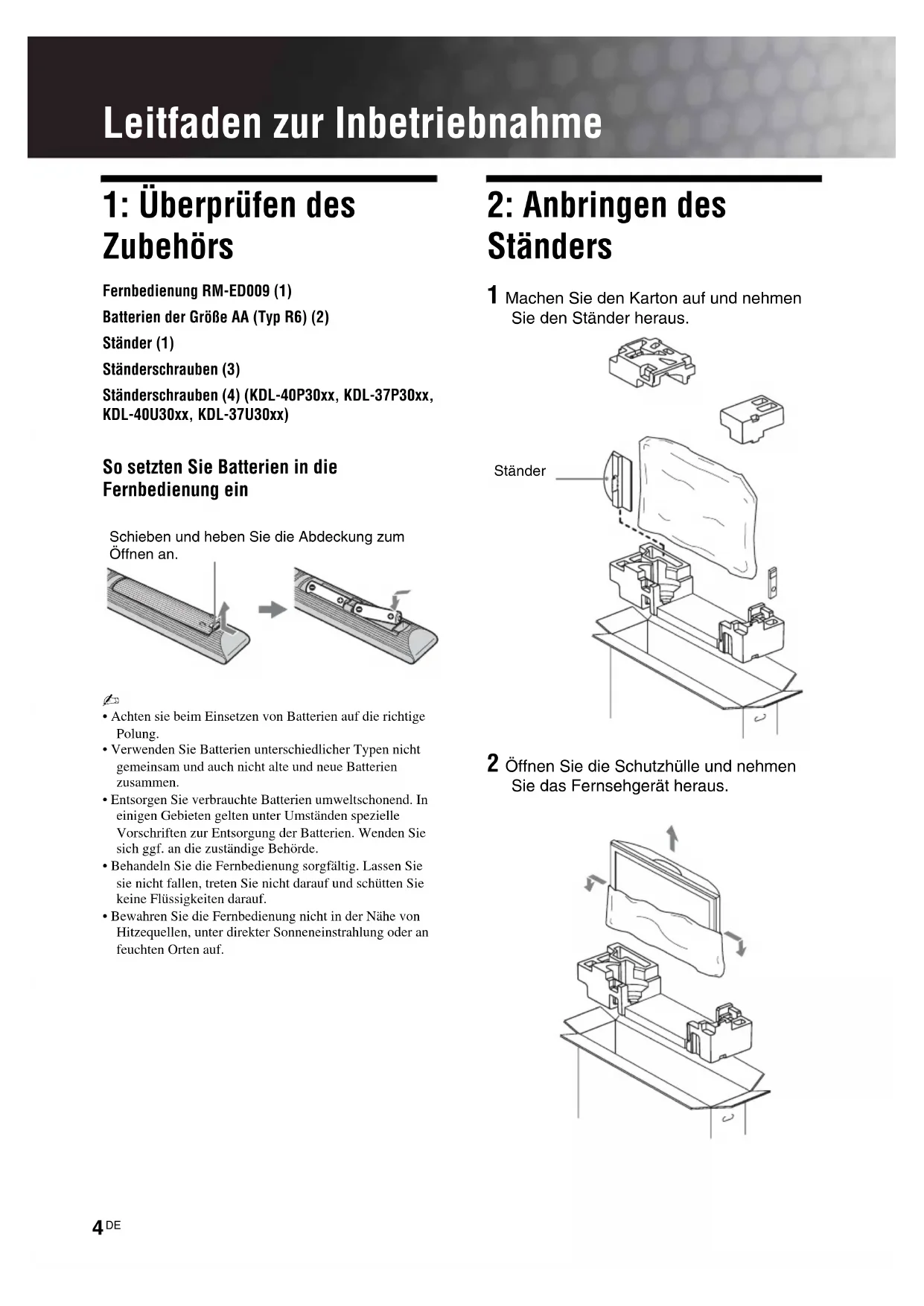 Zubehörs Fernbedienung RM-ED009 (1)Batterien der Größe AA (Typ R6) (2)Ständer (1)Ständerschrauben (3)Ständerschrauben (4) (KDL-40P30xx, KDL-37P30xx, KDL-40U30xx, KDL-37U30xx) So setzten Sie Batterien in die
