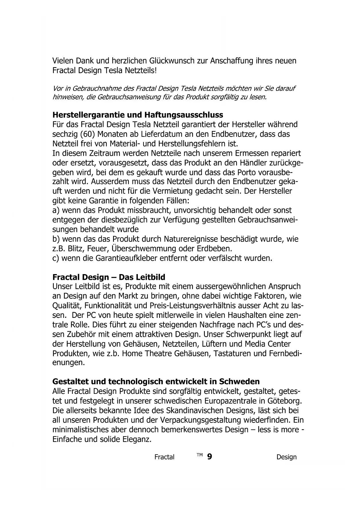 Vielen Dank und herzlichen Glückwunsch zur Anschaffung ihres neuen Fractal Design Tesla Netzteils! Vor in Gebrauchnahme des Fractal Design Tesla Netzteils möchten wir Sie darauf hinweisen, die Gebrauchsanweisung für das Produkt sorgfältig zu lesen. Herstellergarantie und Haftungsausschluss Für das Fractal Design Tesla Netzteil garantiert der Hersteller während sechzig (60) Monaten ab Lieferdatum an den Endbenutzer, dass das Netzteil frei von Material- und Herstellungsfehlern ist. In diesem Zeitraum werden Netzteile nach unserem Ermessen repariert oder ersetzt, vorausgesetzt, dass das Produkt an den Händler zurückge- geben wird, bei dem es gekauft wurde und dass das Porto vorausbe- zahlt wird. Ausserdem muss das Netzteil durch den Endbenutzer geka- uft werden und nicht für die Vermietung gedacht sein. Der Hersteller gibt keine Garantie in folgenden Fällen: a) wenn das Produkt missbraucht, unvorsichtig behandelt oder sonst entgegen der diesbezüglich zur Verfügung gestellten Gebrauchsanwei- sungen behandelt wurde b) wenn das das Produkt durch Naturereignisse beschädigt wurde, wie z.B. Blitz, Feuer, Überschwemmung oder Erdbeben. c) wenn die Garantieaufkleber entfernt oder verfälscht wurden. Fractal Design – Das Leitbild Unser Leitbild ist es, Produkte mit einem aussergewöhnlichen Anspruch an Design auf den Markt zu bringen, ohne dabei wichtige Faktoren, wie Qualität, Funktionalität und Preis-Leistungsverhältnis ausser Acht zu las- sen. Der PC von heute spielt mitlerweile in vielen Haushalten eine zen- trale Rolle. Dies führt zu einer steigenden Nachfrage nach PC’s und des- sen Zubehör mit einem attraktiven Design. Unser Schwerpunkt liegt auf der Herstellung von Gehäusen, Netzteilen, Lüftern und Media Center Produkten, wie z.b. Home Theatre Gehäusen, Tastaturen und Fernbedi- enungen. Gestaltet und technologisch entwickelt in Schweden Alle Fractal Design Produkte sind sorgfältig entwickelt, gestaltet, getes- tet und festgelegt in unserer schwedischen Europazentrale in Göteborg. Die allerseits bekannte Idee des Skandinavischen Designs, läst sich bei all unseren Produkten und der Verpackungsgestaltung wiederfinden. Ein minimalistisches aber dennoch bemerkenswertes Design – less is more - Einfache und solide Eleganz.Fractal Design