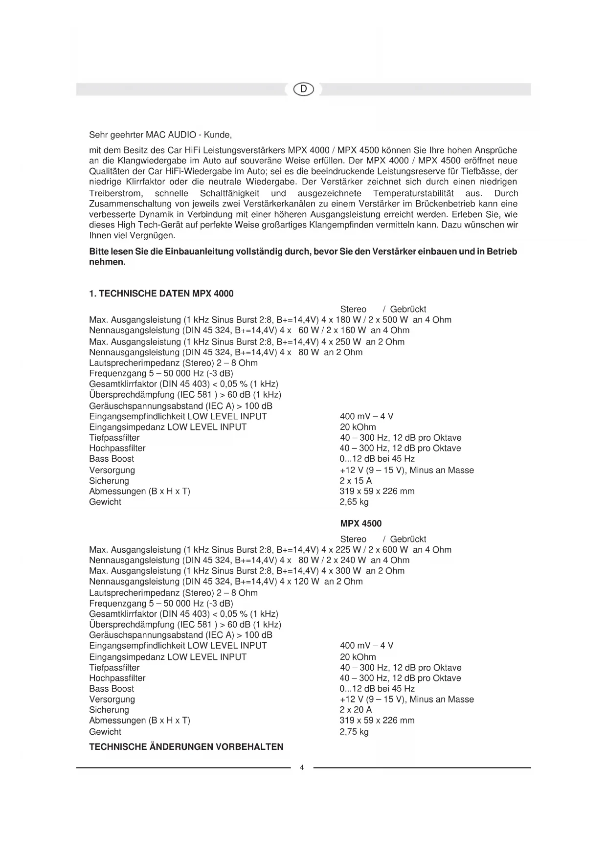 Sehr geehrter MAC AUDIO - Kunde, mit dem Besitz des Car HiFi Leistungsverstärkers MPX 4000 / MPX 4500 können Sie Ihre hohen Ansprüche an die Klangwiedergabe im Auto auf souveräne Weise erfüllen. Der MPX 4000 / MPX 4500 eröffnet neue Qualitäten der Car HiFi-Wiedergabe im Auto; sei es die beeindruckende Leistungsreserve für Tiefbässe, der niedrige Klirrfaktor oder die neutrale Wiedergabe. Der Verstärker zeichnet sich durch einen niedrigen Treiberstrom, schnelle Schaltfähigkeit und ausgezeichnete Temperaturstabilität aus. Durch Zusammenschaltung von jeweils zwei Verstärkerkanälen zu einem Verstärker im Brückenbetrieb kann eine verbesserte Dynamik in Verbindung mit einer höheren Ausgangsleistung erreicht werden. Erleben Sie, wie dieses High Tech-Gerät auf perfekte Weise großartiges Klangempfinden vermitteln kann. Dazu wünschen wir Ihnen viel Vergnügen. Bitte lesen Sie die Einbauanleitung vollständig durch, bevor Sie den Verstärker einbauen und in Betrieb nehmen.