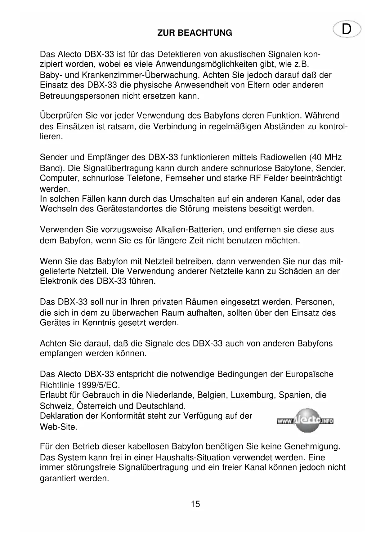 13MAINTENANCE Use a soft moistened cloth to clean the set. Avoid placing the receiver and the transmitter in direct sunlight or wet locations. Do not let water and sand enter the units. In case the transmitted signal is disturbed or interrupted, check the functionality at another location first, prior to send it in for repair. Always remove the batteries in case the unit is not in use for a longer period. TROUBLESHOOTING Should any problem occur, please check the list below. bad or no reception: battery is weak or empty, replace battery channel switch is set wrong, change channel transmitter-receiver distance too large, reduce distance adapter connection wrong, check adapter connection noise and other sounds: other transmitter present, change channels disturbance by other devices, switch off other devices (when possible) shrill tone: transmitter too close to the receiver, increase distance volume of receiver is set too high, reduce volume 14ZUR BEACHTUNG Das Alecto DBX-33 ist für das Detektieren von akustischen Signalen kon- zipiert worden, wobei es viele Anwendungsmöglichkeiten gibt, wie z.B. Baby- und Krankenzimmer-Überwachung. Achten Sie jedoch darauf daß der Einsatz des DBX-33 die physische Anwesendheit von Eltern oder anderen Betreuungspersonen nicht ersetzen kann. Überprüfen Sie vor jeder Verwendung des Babyfons deren Funktion. Während des Einsätzen ist ratsam, die Verbindung in regelmäßigen Abständen zu kontrol- lieren. Sender und Empfänger des DBX-33 funktionieren mittels Radiowellen (40 MHz Band). Die Signalübertragung kann durch andere schnurlose Babyfone, Sender, Computer, schnurlose Telefone, Fernseher und starke RF Felder beeinträchtigt werden. In solchen Fällen kann durch das Umschalten auf ein anderen Kanal, oder das Wechseln des Gerätestandortes die Störung meistens beseitigt werden. Verwenden Sie vorzugsweise Alkalien-Batterien, und entfernen sie diese aus dem Babyfon, wenn Sie es für längere Zeit nicht benutzen möchten. Wenn Sie das Babyfon mit Netzteil betreiben, dann verwenden Sie nur das mit- gelieferte Netzteil. Die Verwendung anderer Netzteile kann zu Schäden an der Elektronik des DBX-33 führen. Das DBX-33 soll nur in Ihren privaten Räumen eingesetzt werden. Personen, die sich in dem zu überwachen Raum aufhalten, sollten über den Einsatz des Gerätes in Kenntnis gesetzt werden. Achten Sie darauf, daß die Signale des DBX-33 auch von anderen Babyfons empfangen werden können. Das Alecto DBX-33 entspricht die notwendige Bedingungen der Europaïsche Richtlinie 1999/5/EC. Erlaubt für Gebrauch in die Niederlande, Belgien, Luxemburg, Spanien, die Schweiz, Österreich und Deutschland. Deklaration der Konformität steht zur Verfügung auf der Web-Site. Für den Betrieb dieser kabellosen Babyfon benötigen Sie keine Genehmigung. Das System kann frei in einer Haushalts-Situation verwendet werden. Eine immer störungsfreie Signalübertragung und ein freier Kanal können jedoch nicht garantiert werden.